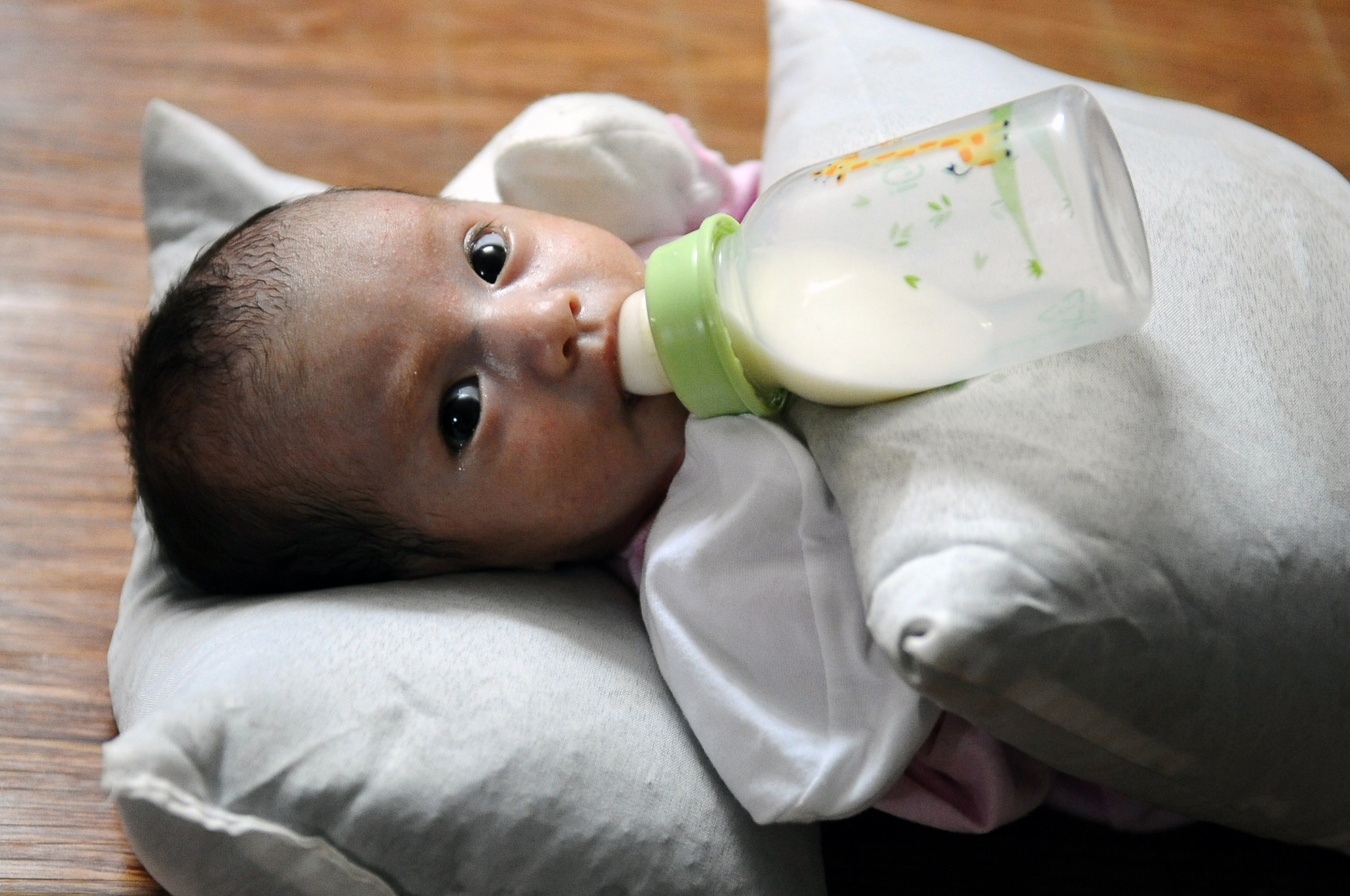 | Bé Mai Anh mới 23 ngày tuổi tự nằm ăn. Bình sữa được kê bằng một chiếc gối bởi bảo mẫu không có thời gian ngồi giữ chờ các con ăn xong. |