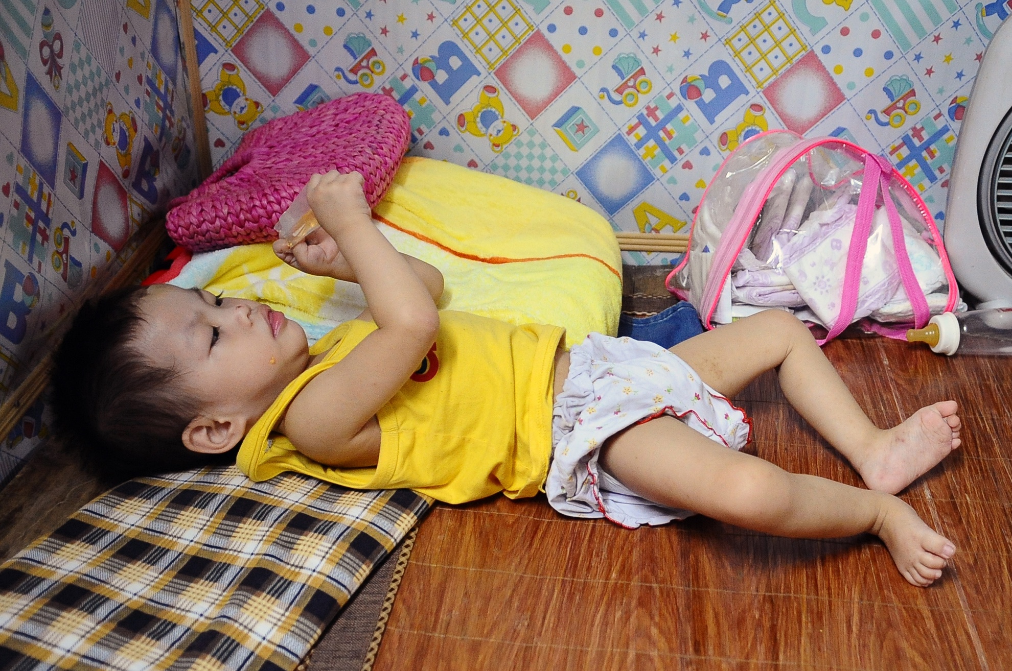| Bé Hà Anh bị liệt một bên, tập luyện mất một năm mới ngồi được nhưng không thể đi lại. Hàng ngày em chỉ nằm một chỗ chẳng có bạn nào chạy đến chơi cùng. |