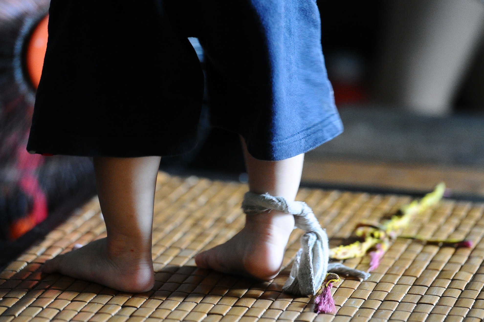 | Quốc Anh lười ăn và rất hiếu động nên bảo mẫu phải buộc chân để cậu bé khỏi nghịch. |