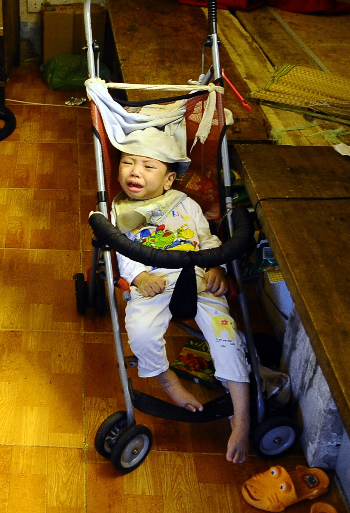 | Bên trong những căn phòng tại chùa còn nhiều em cả ngày chỉ ngồi và nằm một mình một chỗ trong cũi không ai chơi cùng. Có em cứ ngồi xe đẩy mà khóc. |