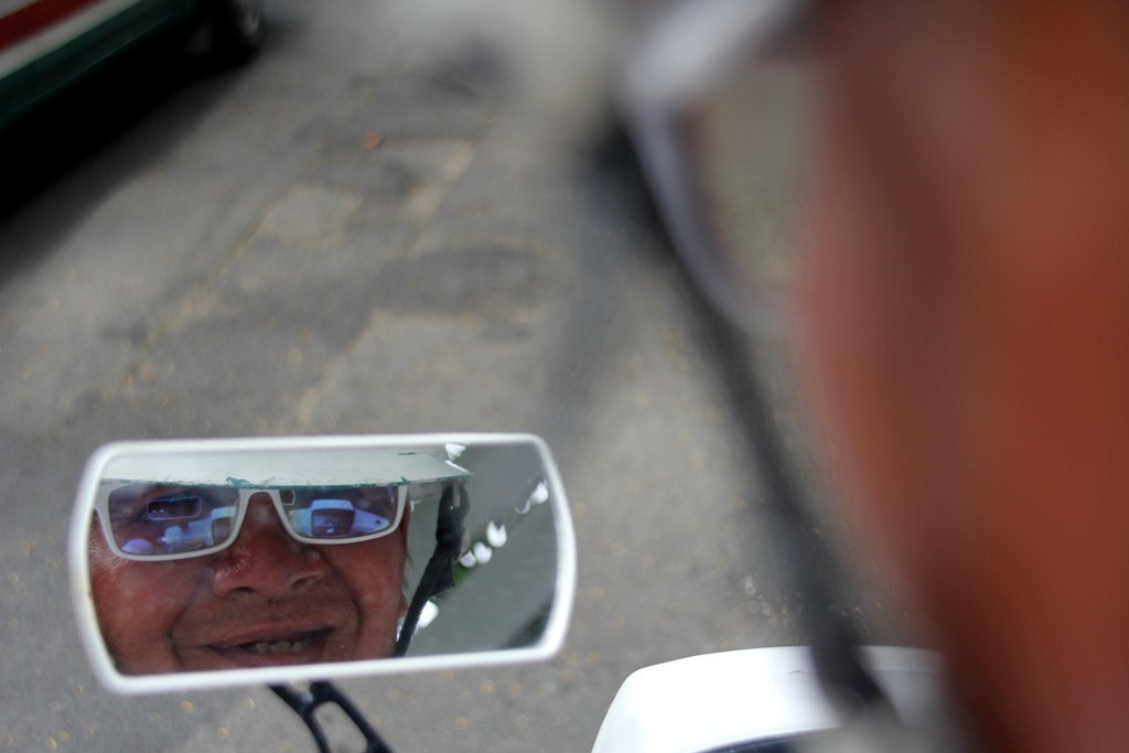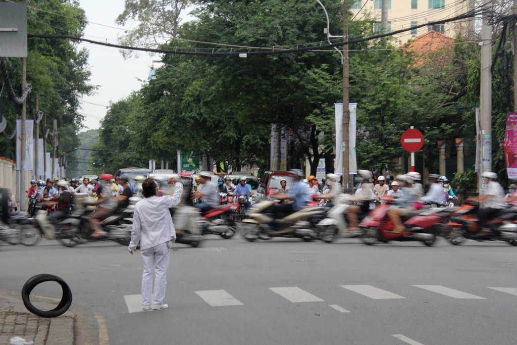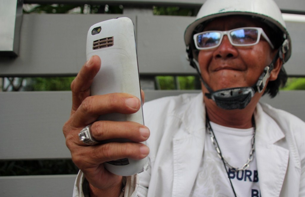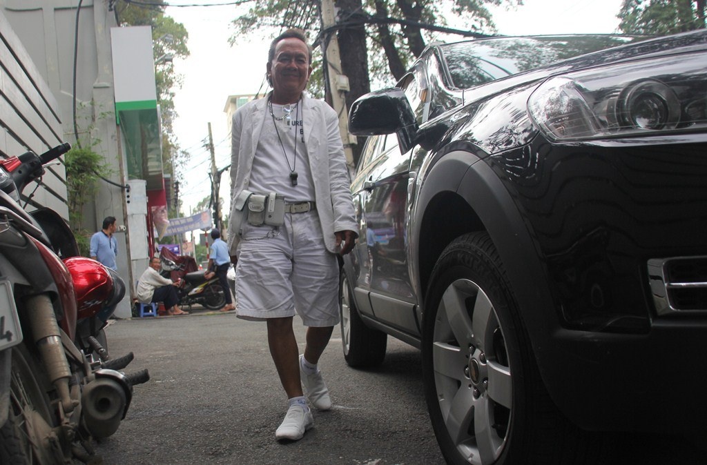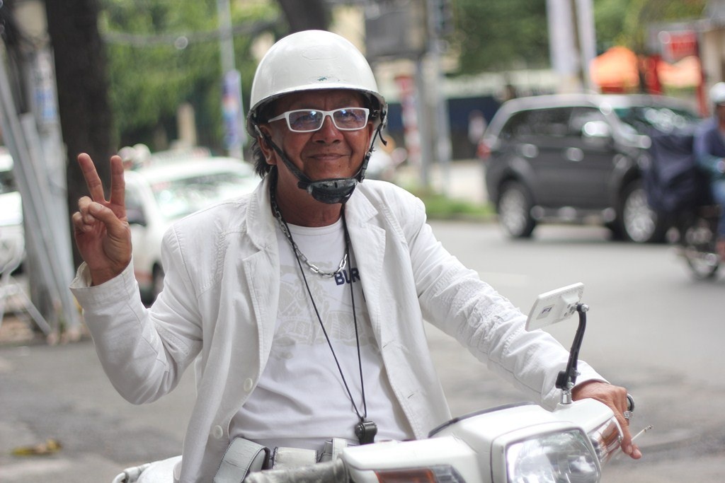 | Buổi sáng ông dạy từ 5h30, chạy ra góc đường Nguyễn Thị Minh Khai - Nam Kỳ Khởi Nghĩa để hành nghề xe ôm. Công việc này ông làm từ 12 năm. Tuy nhiên chỉ 3 năm nay ông mới chọn cho mình phong cách toàn màu trắng từ xe, quần áo cho đến vật dụng cá nhân. Vì nét phá cách đó nên ông có rất nhiều khách đi xe ôm, nhất là người ngoại quốc. |