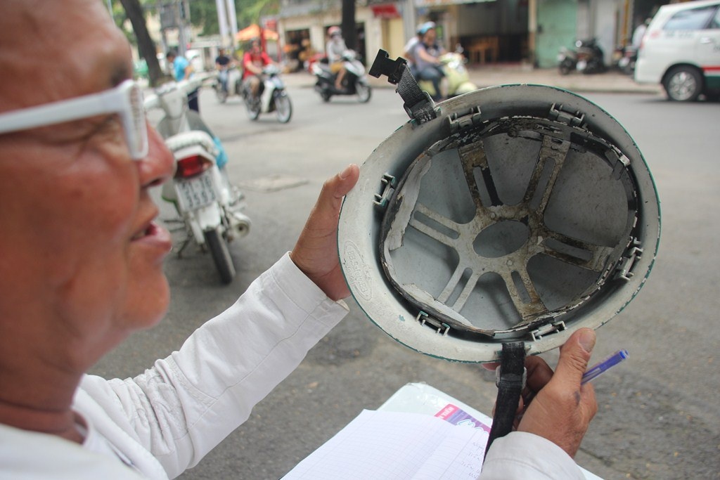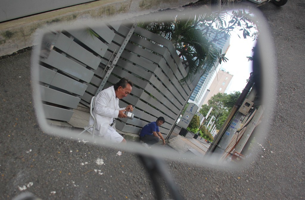 | Sau khi chạy xe ôm, mua cơm, đi chợ thuê... xong, đến 12h ông bắt đầu tính toán lại những việc đã làm trong buổi sáng. Ông luôn mang theo chiếc ghế, ba lô màu trắng để nghỉ ngơi và làm việc ngay vệ đường, với phong thái rất ung dung, tự tại. |