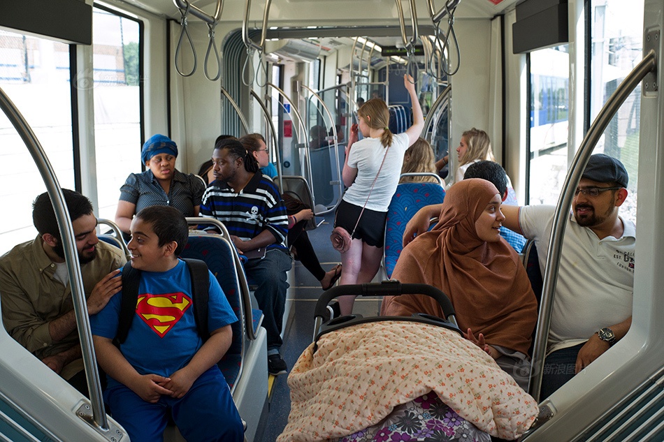 (Từ trái qua) Khidar Mehmud ngồi cùng em trai, Zakariya; chị gái, Kanwal Mehmud và anh rể, Yasir Farhran trên tàu điện tại thành phố Minneapolis. “Pakistan chỉ có người Pakistan. Mọi người đều trông giống nhau, ăn mặc giống nhau. Ở đây mọi người đến từ các nền văn hóa khác nhau và tôi thích điều đó”, Kanwal Mehmud chia sẻ về xã hội đa sắc tộc ở đây. |