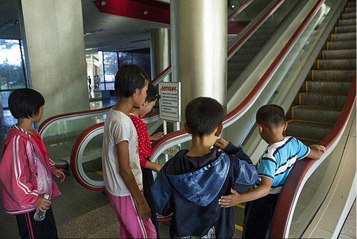 | Trẻ em Triều Tiên thích thú với cầu thang máy ở trại hè trẻ em quốc tế Songdowon. |
