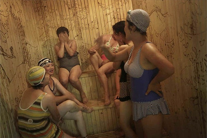 | Giây phút thư giãn trong phòng tắm hơi của nhóm công nhân nữ của nhà máy dệt Kim Jong Suk sau giờ làm việc căng thẳng. |