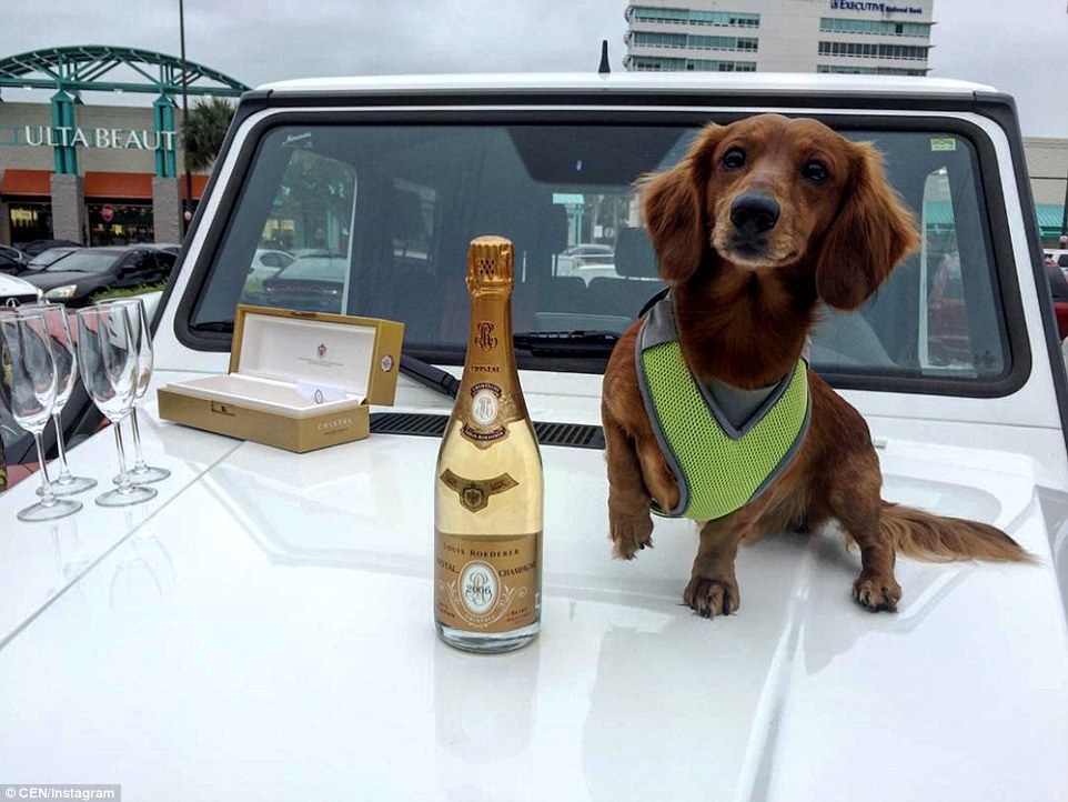 | Chú chó nhỏ cùng chai rượu sang xuất hiện trên ca-pô một chiếc ôtô tại bãi đỗ xe trung tâm mua sắm thu hút sự quan tâm của mọi người. |