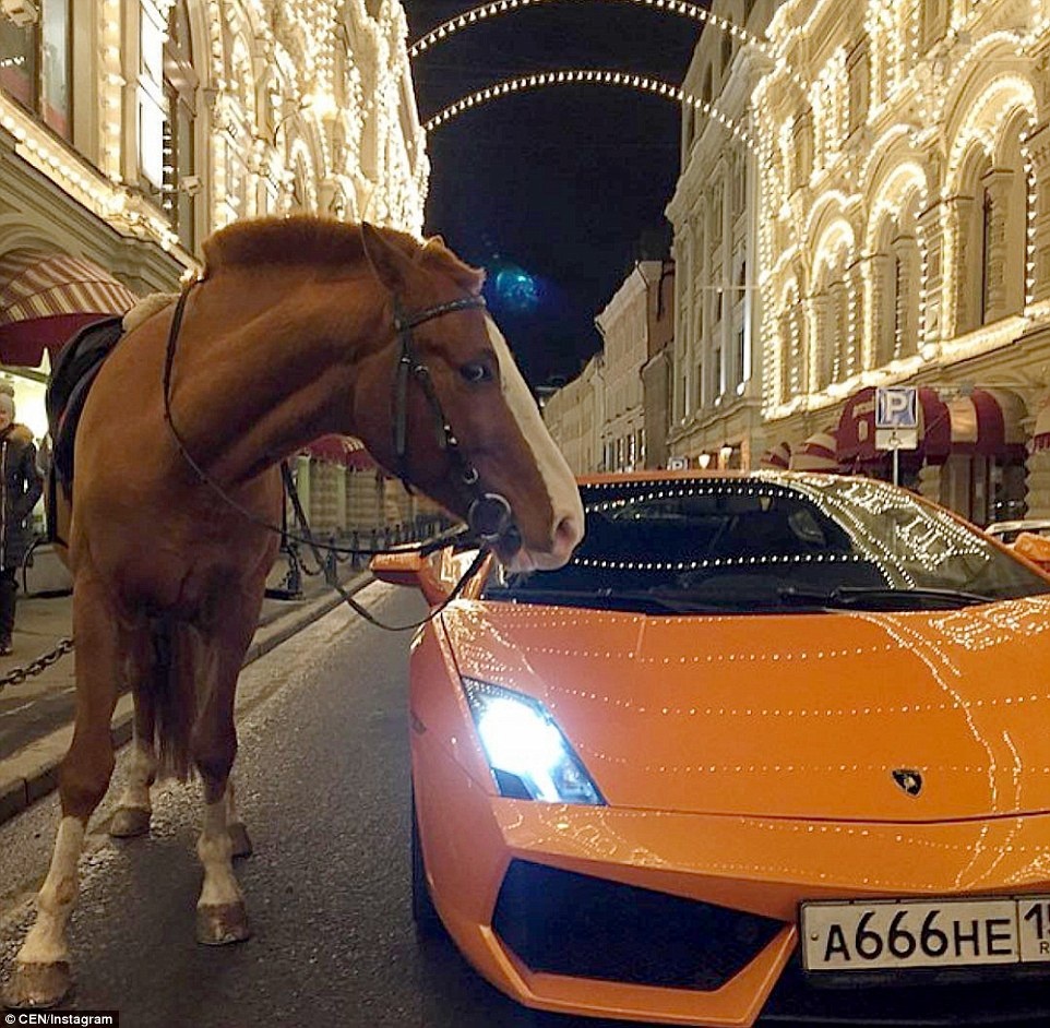 | Hình ảnh thu hút sự chú ý của nhiều người khi chú ngựa đang ngắm nghía chiếc Lamborghini trên đường phố nước Nga. |