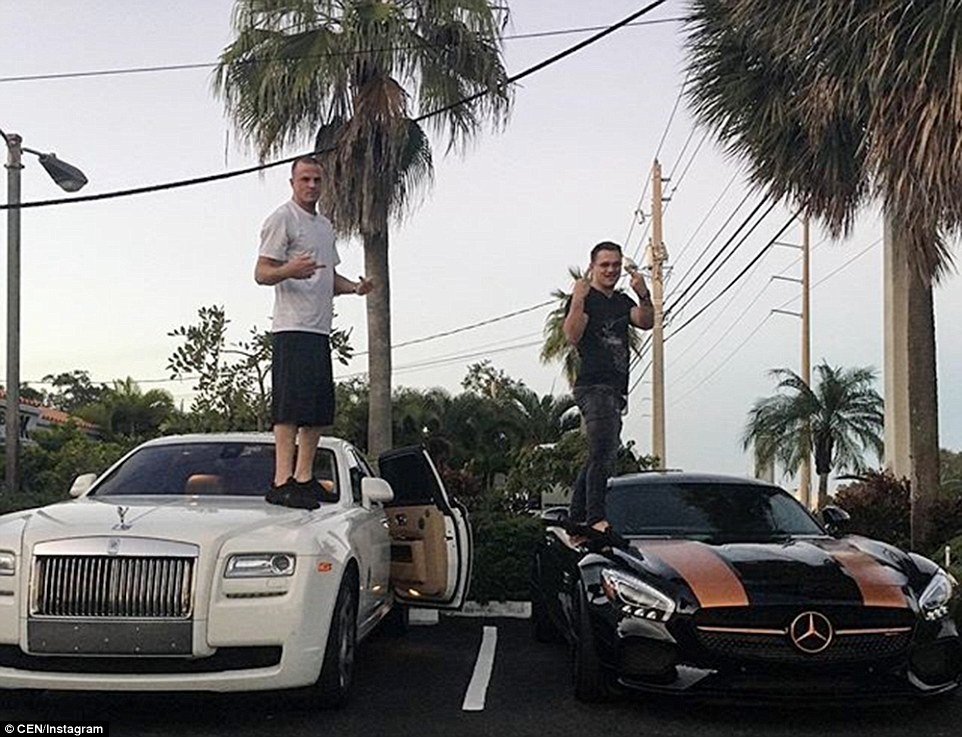 | Hai chàng trai hào hứng đứng trên những chiếc xế hộp đắt giá. |