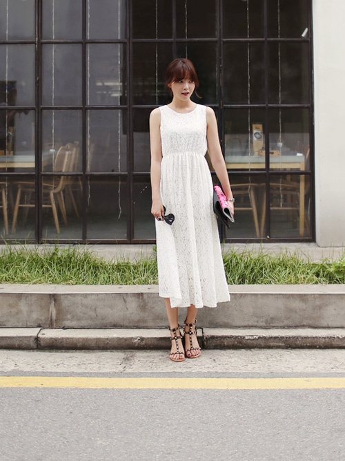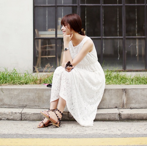 | Gợi ý xinh đẹp khi xuống phố với maxi ren và dép bệt. |
