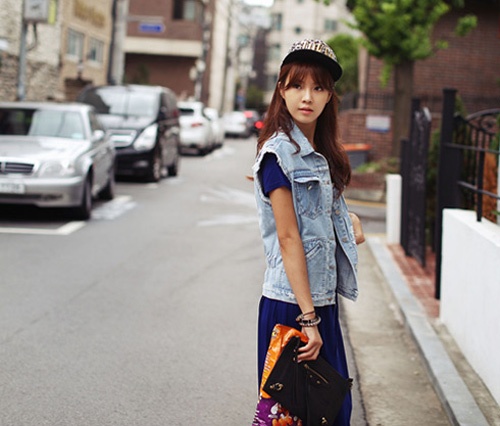 | Gợi ý với cách mix maxi và áo gile denim. |
