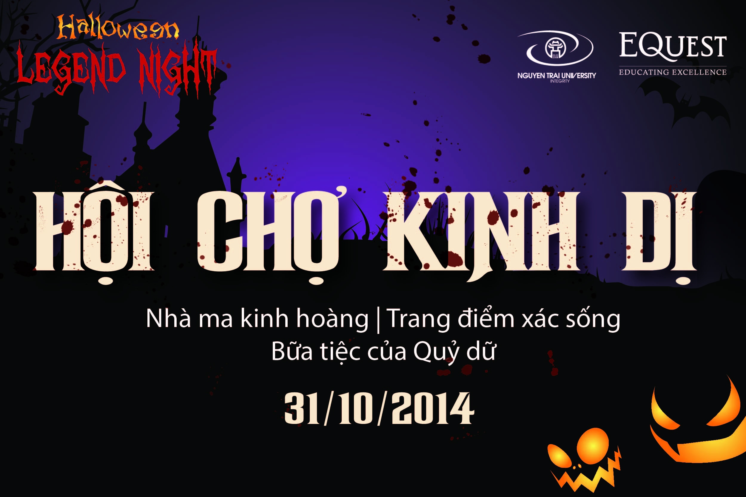 Chương trình gồm hàng loạt hoạt động hấp dẫn như: hội chợ kinh dị, tiết mục tranh tài gay cấn của học sinh sinh viên cùng những màn biểu diễn sôi động đến từ khách mời Dương Trần Nghĩa, beatboxer Minh Kiên, nhóm nhảy Vietnam’s got talent 2014 Bar-TN, DJ Dannies… Chương trình do Học viện Anh Ngữ EQuest phối hợp cùng Đại học Nguyễn Trãi tổ chức.