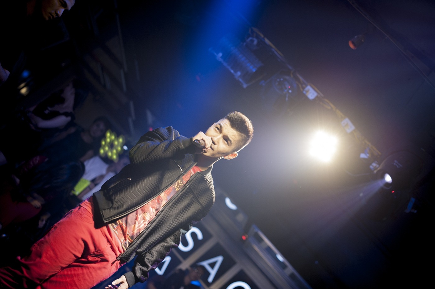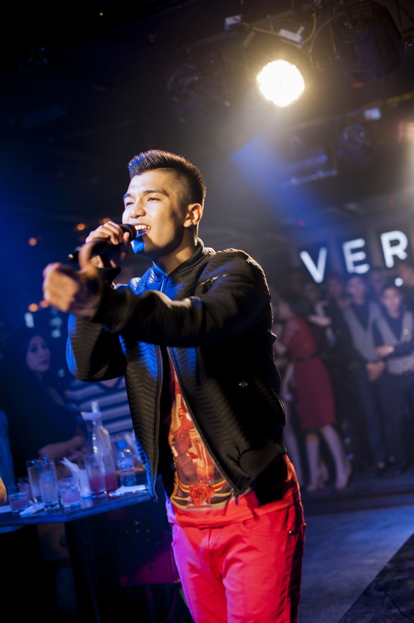 Bạn trai cũ của Chi Pu không ngần ngại kéo chiếc áo pull màu đỏ che kín mặt khi đang biểu diễn trên sân khấu.