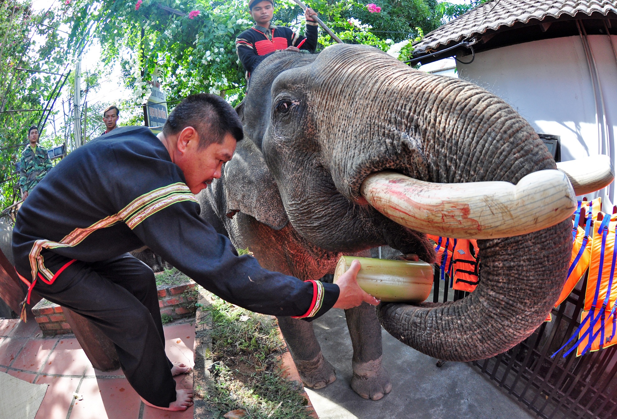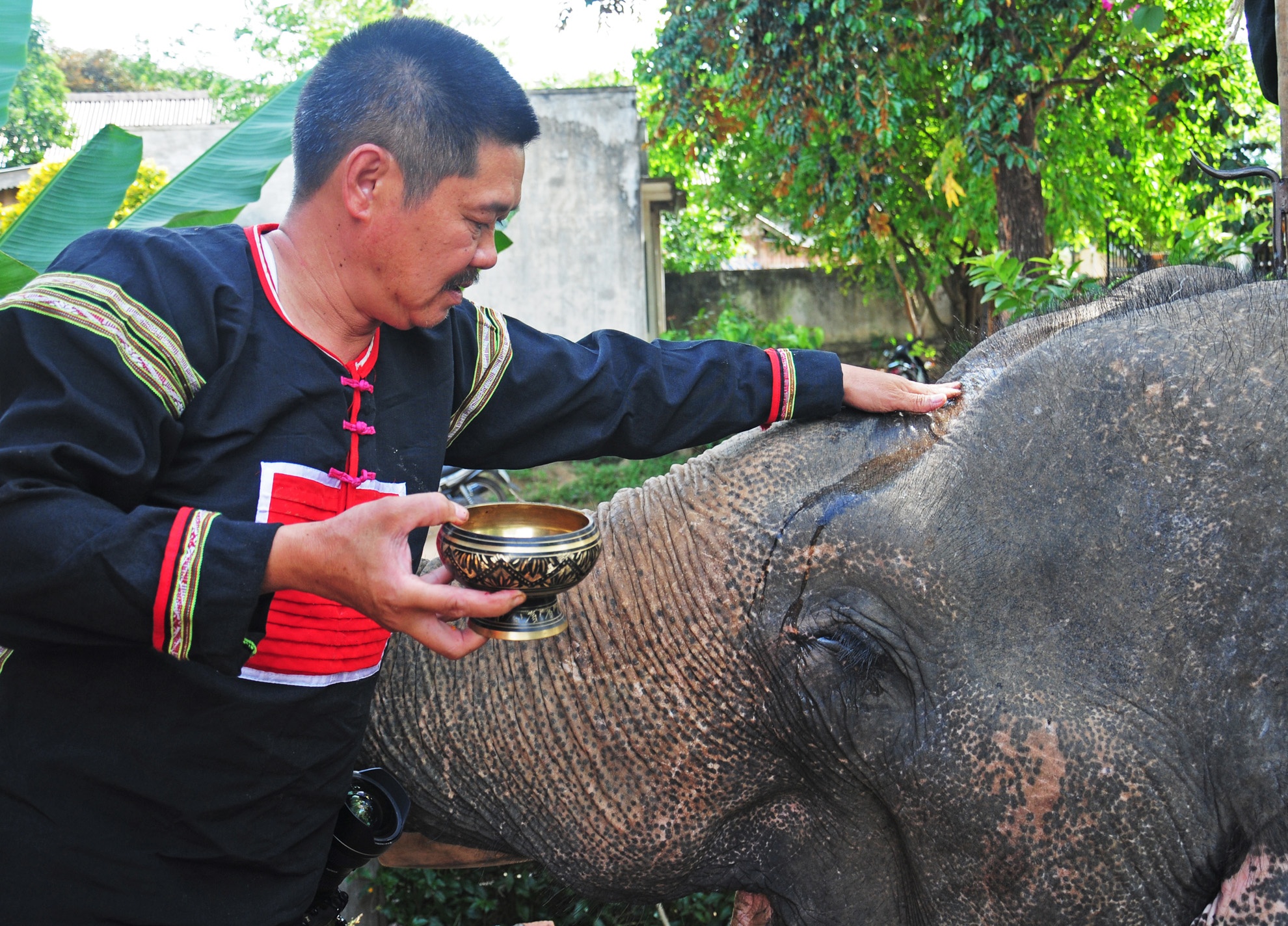 Tập tục xoa rượu giữa trán cầu mong cho voi khỏe mạnh.