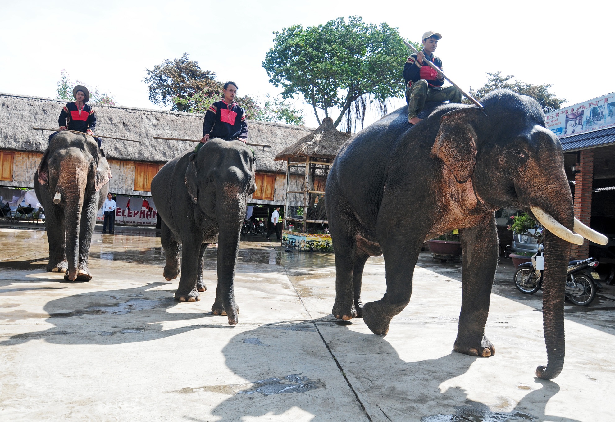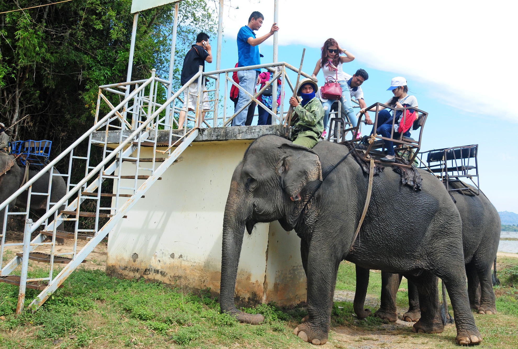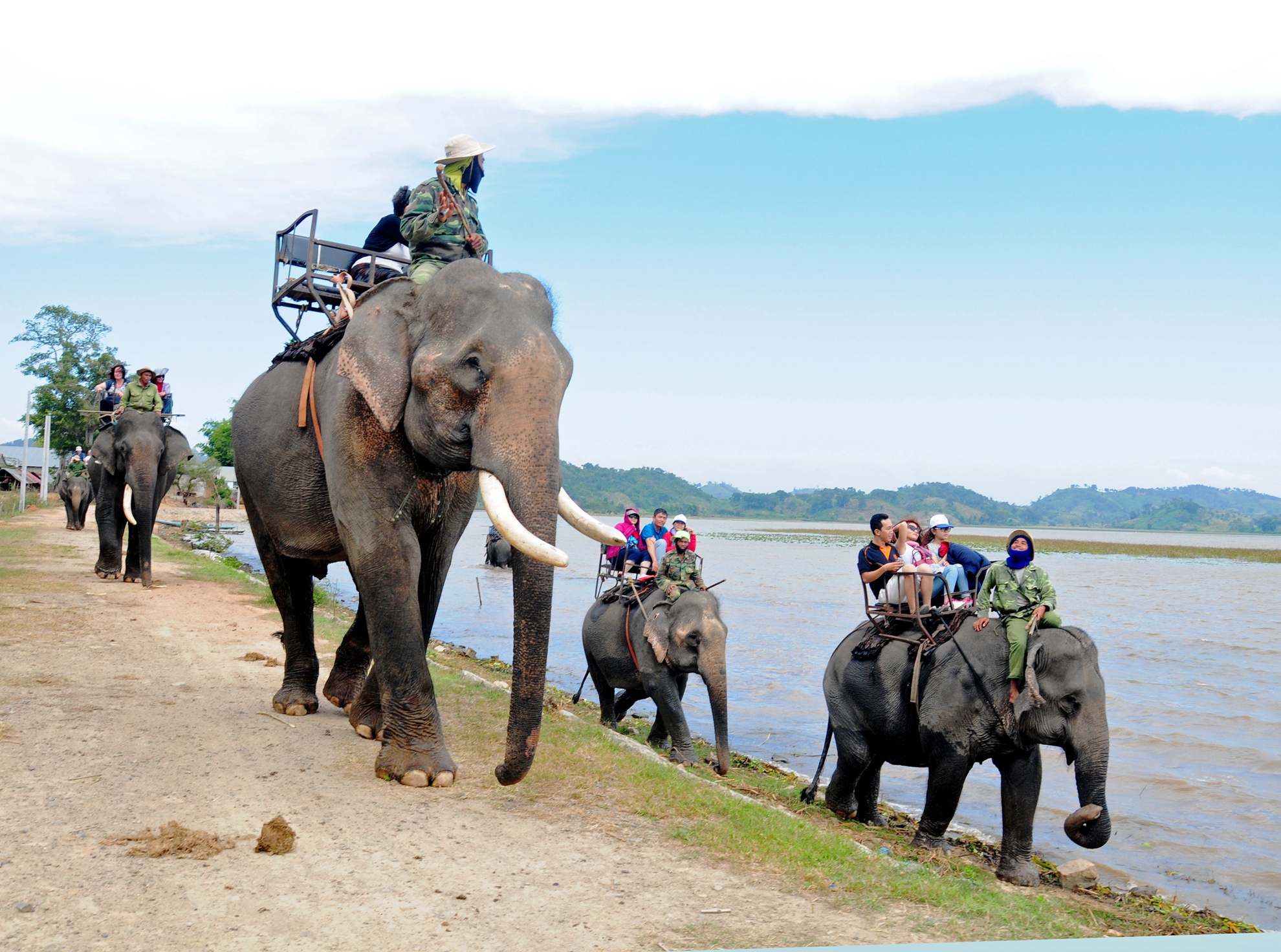 Du khách quốc tế thích thú cưỡi voi Tây Nguyên Du khách quốc tế ngồi trên lưng đàn voi nhà của gia đình anh Đàng Năng Long để thưởng ngoạn không gian thanh bình của Tây Nguyên quanh hồ Lắk (huyện Lắk, tỉnh Đắk Lắk).