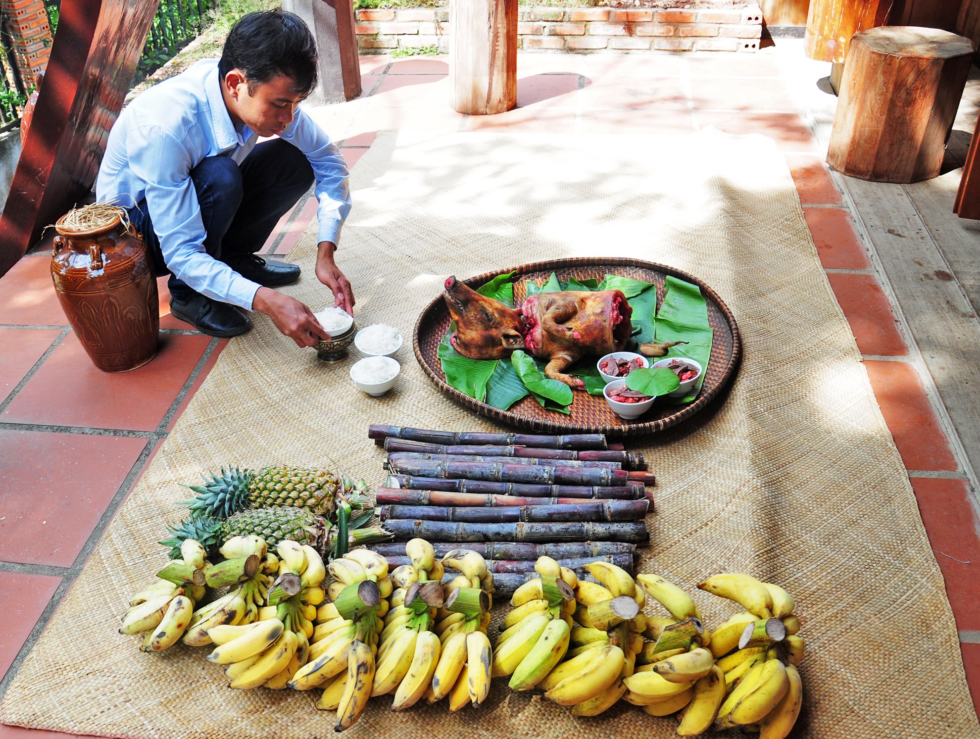 Nghi thức thắp nến cúng sức khỏe cho voi của gia đình ông Long.