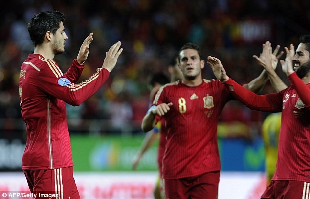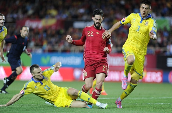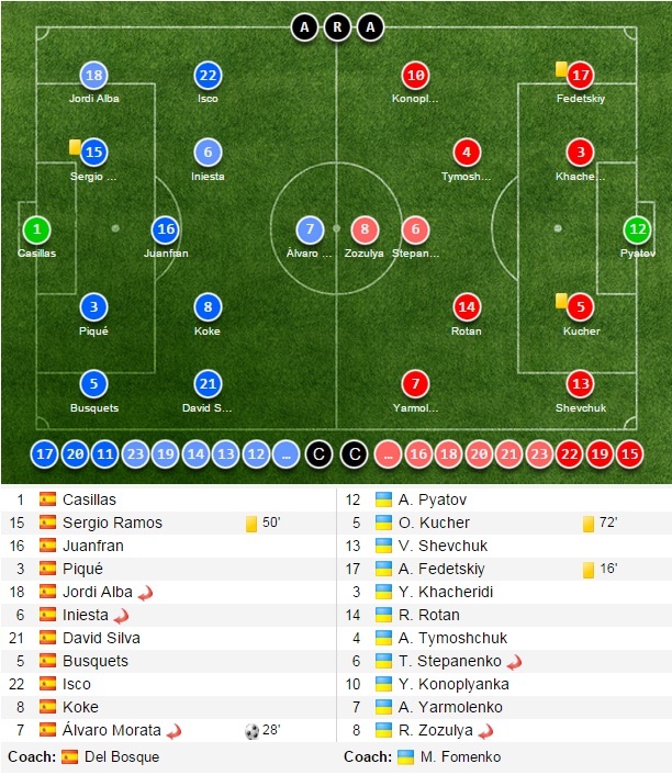 | Đội hình thi đấu của Tây Ban Nha và Ukraina ở lượt trận thứ 5 bảng C vòng loại EURO 2016. |