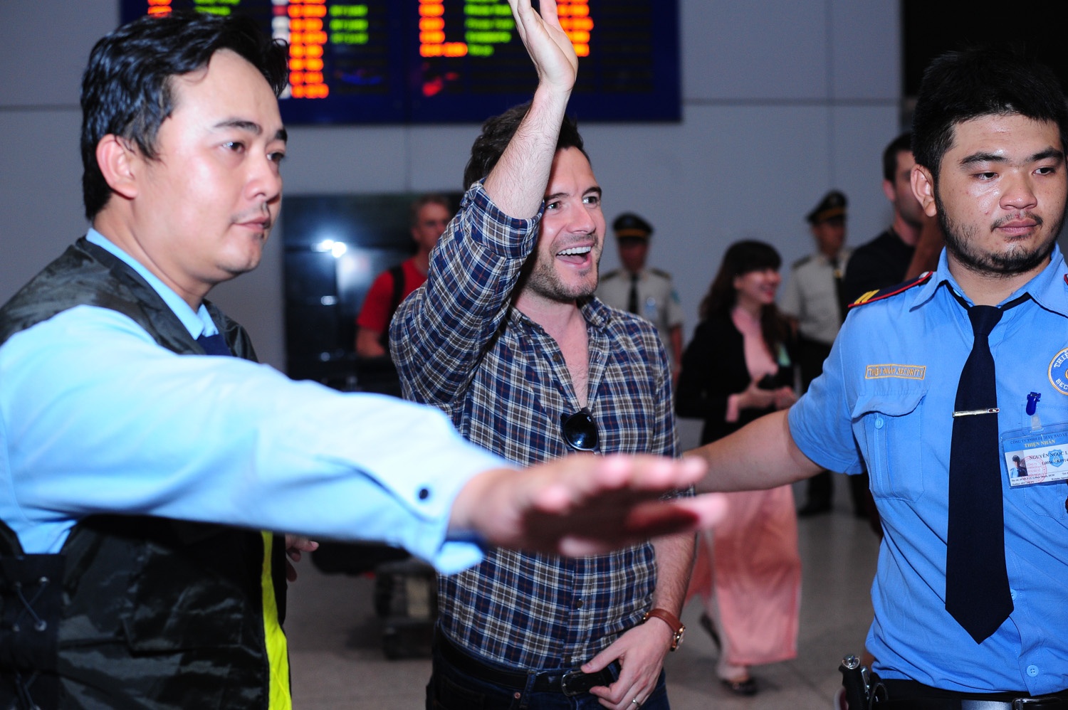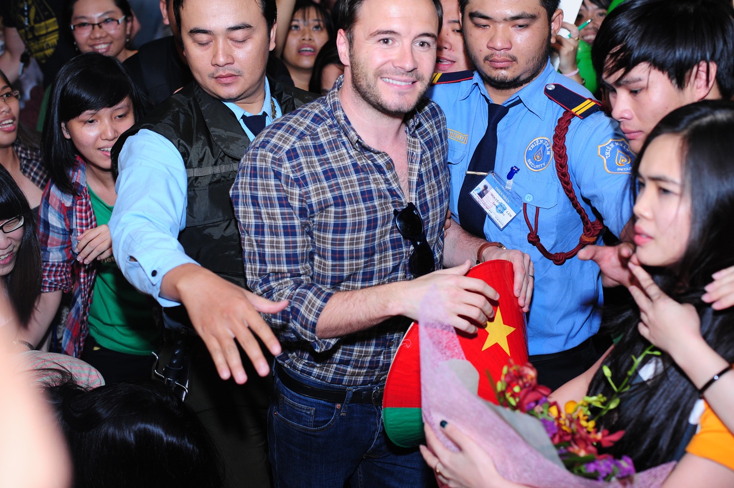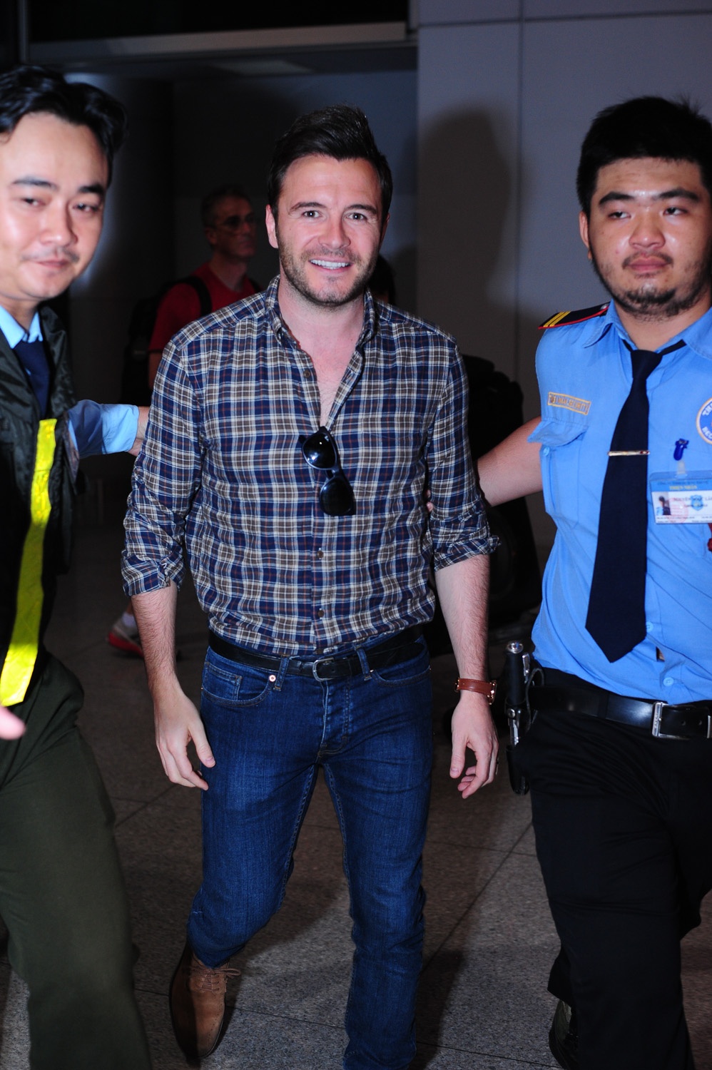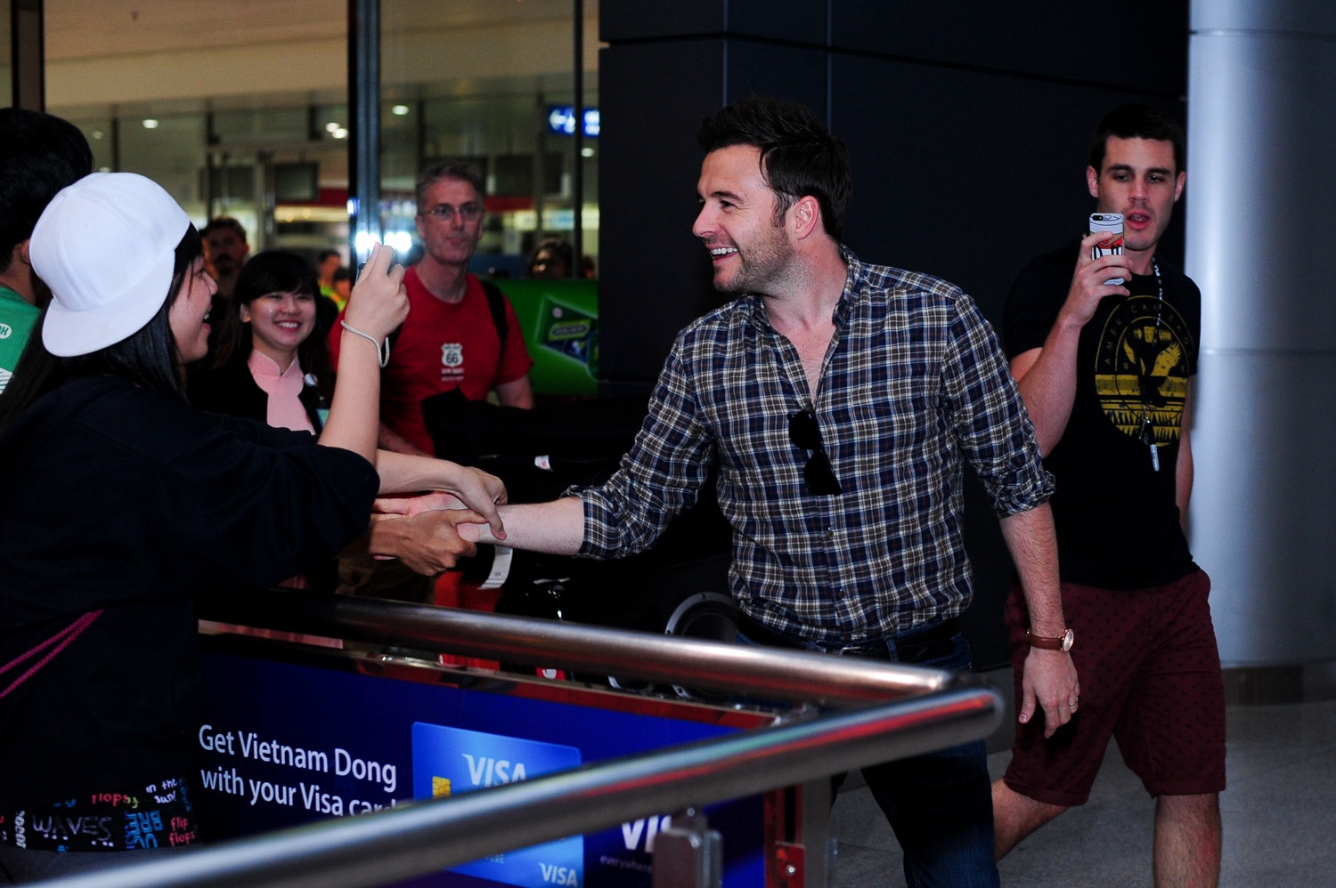 | Khoảng 17h30 ngày 14/9, Shane Filan - cựu thủ lĩnh nhóm nhạc đình đám một thời Westlife - có mặt tại sân bay Tân Sơn Nhất để chuẩn bị cho những hoạt động nằm trong tour diễn You and Me Tour Live in Saigon. Nam ca sĩ Beautiful in White diện trang phục kẻ caro đơn giản, thân thiện bắt tay người hâm mộ Việt Nam. |