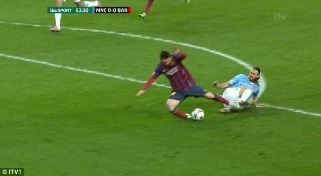 | Chỉ khi chân của hậu vệ Man xanh gạt chân trụ Messi trong vòng cấm, tiền đạo của Barca mới ngã. |