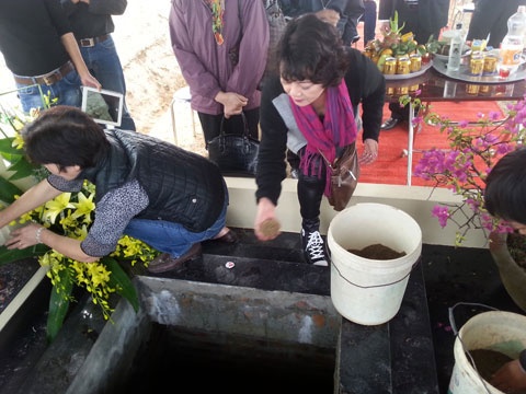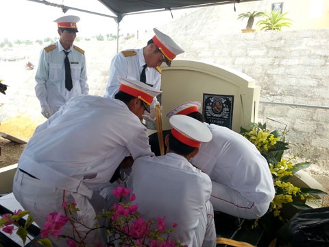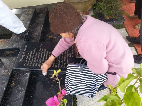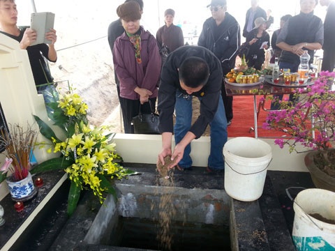 | Anh Nguyễn Văn Thắng, con trai cố nghệ sĩ cầm nắm cát rải lên mộ cha |