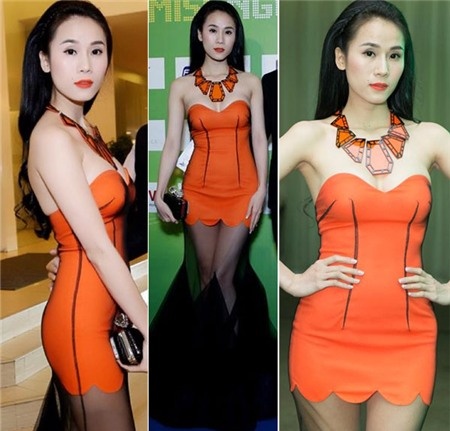 | Thái Hà tươi rói với bộ váy màu cam kết hợp vòng cổ gam màu cam cùng tông. |