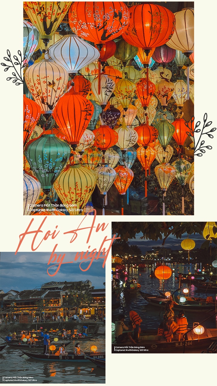 Chèo thuyền trên sông Hoài là trải nghiệm được nhiều du khách yêu thích khi đến Hội An. Trong ánh nắng yếu ớt cuối ngày, mặt trời như tan loãng trên mặt sông phẳng lặng, mang đến khung cảnh óng ánh đẹp như tranh vẽ. Trong những bức ảnh được Galaxy S22 Ultra ghi lại, vào thời khắc chuyển giao giữa ngày và đêm, Hội An dù đông đúc vẫn giữ được nét bình yên, pha lẫn thêm sự huyền bí của một thành phố trăm tuổi.