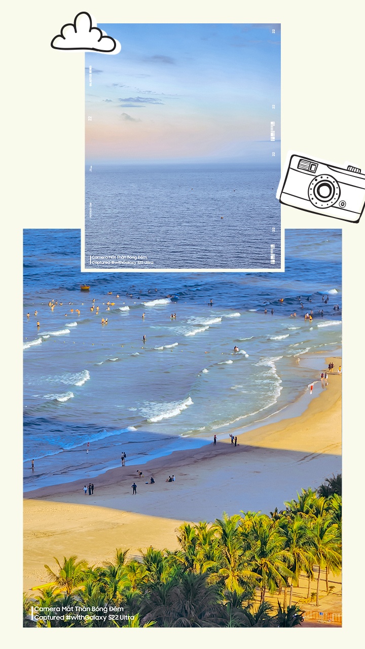 Hiếm thành phố nào biển đẹp và thơ mộng như nơi đây. Qua lăng kính Galaxy S22 Ultra, mặt biển mơ màng như dải lụa xanh mềm mại uyển chuyển ôm trọn lấy bờ cát trắng tinh, trải dài tít tắp. Sóng vào mùa hè cũng trở nên hiền hòa đến lạ, trắng xóa và dịu dàng như những cụm bông gòn nhẹ nhàng xô vào bờ cát.