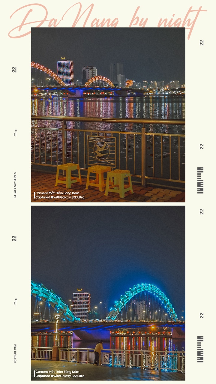 Qua lăng kính Galaxy S22 Ultra, ánh đèn LED được xử lý mượt mà, không bị quá gắt, các tia sáng giảm hiện tượng chói lóa khiến cầu Rồng càng thêm phần ấn tượng.