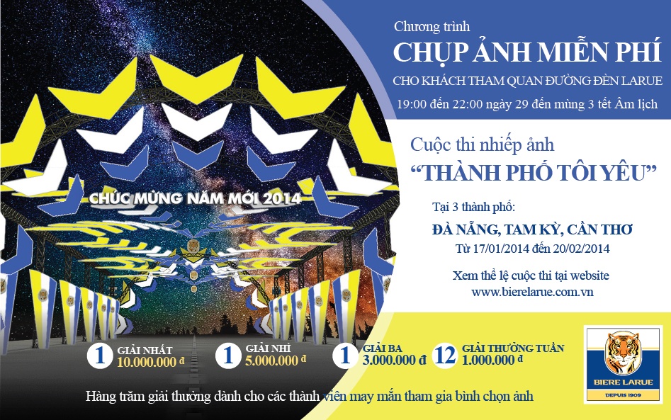 Để lưu giữ những kỷ niệm đẹp này, bên cạnh chương trình chụp ảnh miễn phí mỗi tối từ 19h đến 22h ngày 29 đến mùng 3 âm lịch, Larue còn tổ chức một cuộc thi nhiếp ảnh Thành phố tôi yêu. Người dân thành phố và du khách muốn tham gia có thể gửi những bức ảnh ghi lại giây phút khó quên cùng bạn bè, người thân mà đường đèn Larue đã mang lại. Chương trình trang trí nghệ thuật bắt đầu từ ngày 20/1 cho đến 7/2. Thông tin chi tiết về cuộc thi có tại website www.bierelarue.com.vn.