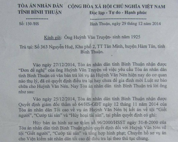 Sáng 31/12, ông Huỳnh Văn Truyện (89 tuổi, cha của phạm nhân Huỳnh Văn Nén) cho biết đã nhận được văn bản trả lời của Chánh tòa Hình sự TAND tỉnh Bình Thuận, thông báo cơ quan này đã nhận được Quyết định giám đốc thẩm của Hội đồng Thẩm phán TAND Tối cao vào 6 ngày trước.