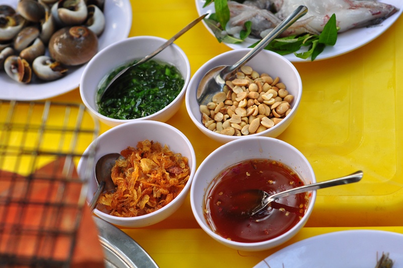 Ăn đồ nướng nơi này khá thú vị. Bao giờ khách cũng được chuẩn bị 4 bát gồm: lạc, mỡ hành, hành phi và nước mắm nướng - loại nước sốt đặc biệt làm từ nước mắm, muối, tiêu, ớt,... nấu chín. Đây là những gia giảm đi kèm để khách tự tay tẩm ướp với hải sản. Chẳng hạn, khi bạn ăn tôm, răng mực hay bạch tuộc thì cho nước mắm nướng là hợp lý nhất. Phải chấm điểm cao cho loại nước sốt này, rất ngon - đặc sánh, đậm đà, cay cay, phết lên hải sản tạo ra món nướng muối ớt cực hấp dẫn. Có lẽ chỉ cần nhìn với ngửi thôi khách đã khó cầm lòng. Nước mắm ngấm với hải sản nóng sốt, giòn giòn, ăn rồi khách còn thấy "đã đời" hơn.