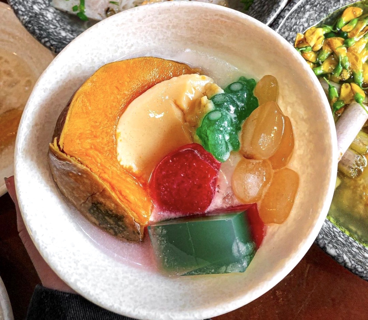 Món chè bí chưng (tiếng Campuchia gọi là num-à-pơi) mang đậm hương vị ẩm thực của xứ sở Chùa Tháp. Trái bí đỏ được khoét ruột, thêm hỗn hợp gồm sữa bột, sữa đặc, nước cốt dừa, lòng đỏ trứng đã đánh đều, rồi được đem hấp cách thủy. Thực khách thưởng thức chè kèm đá bào để cảm nhận trọn vị thanh mát. Chợ Lê Hồng Phong (quận 10) là nơi bạn có thể nhâm nhi kiểu chè lạ miệng này. Ảnh: Citastyfood. |