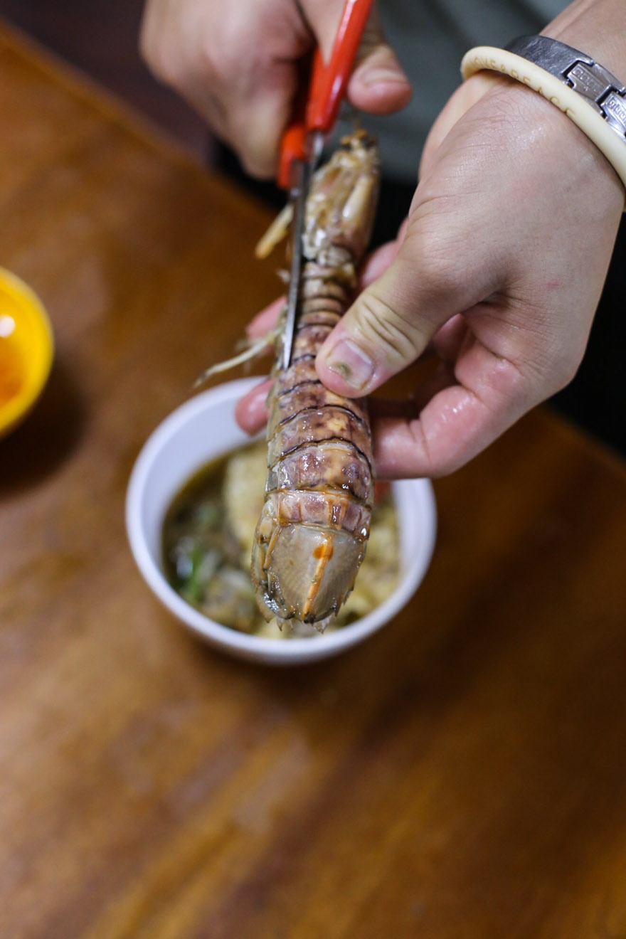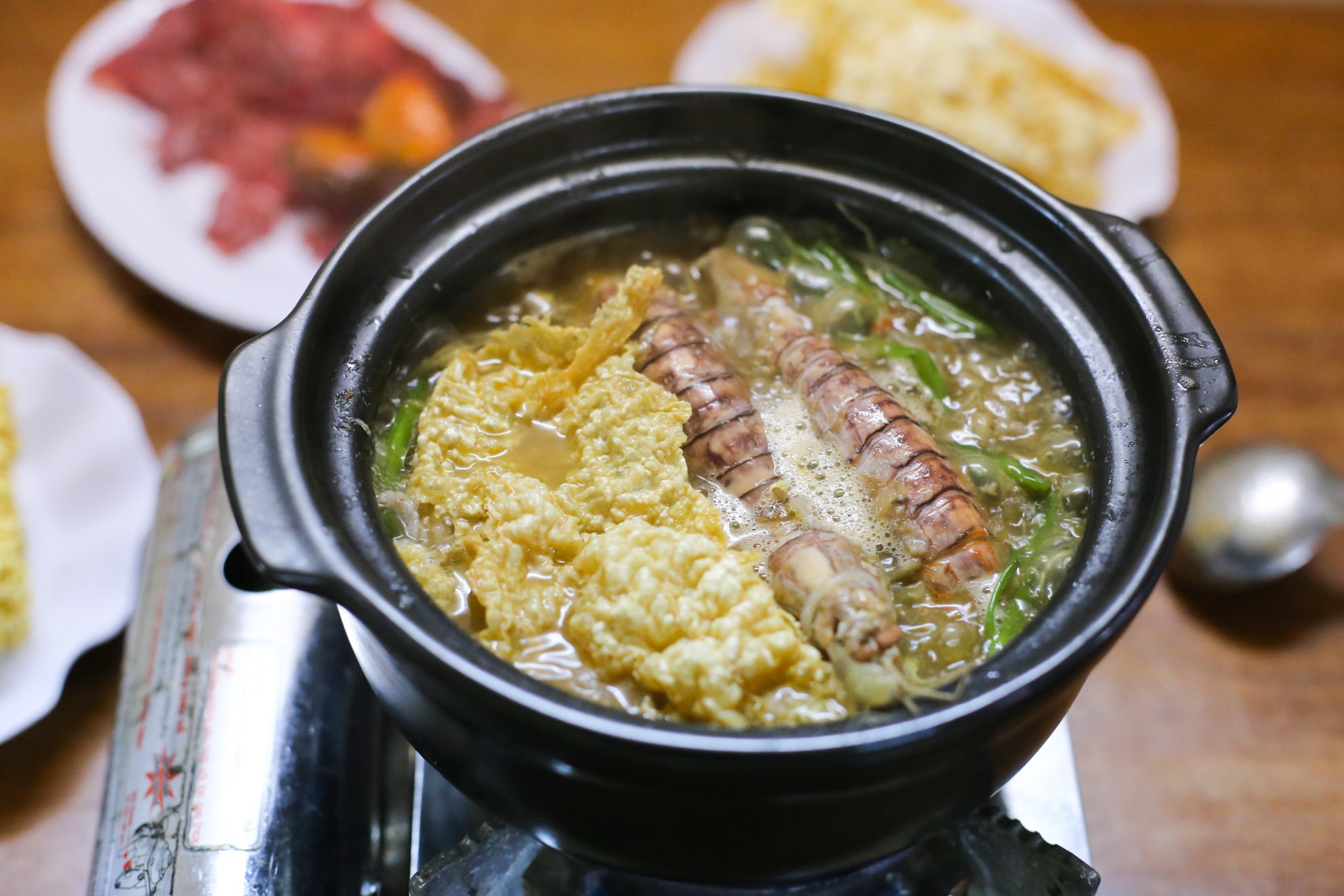 Sau khi đã khai vị với những con ngán ngon, lạ, đắt, bạn đừng quên thử món lẩu bề bề (tôm tích). Cách chế biến món này khá lạ. Cụ thể, nước lẩu được nấu bằng bề bề và một loại nước sốt được làm bằng cá nguyên chất. Sự kết hợp này đã mang đến một loại nước nhúng vừa ngọt, vừa thơm. Quán còn sang chảnh hơn khi cho thêm phần gạch bề bề, khiến nó càng dậy mùi và béo ngậy.