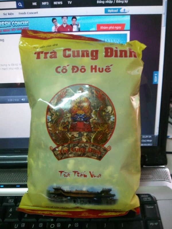 Trà cung đình được chế biến theo công thức được coi là lấy từ trong cung đình nhà Nguyễn thời xưa, là thức uống dành cho vua chúa. Trà cung đình Huế nay được đóng gói dạng tiện lợi, dễ mua về làm quà. Vị trà ngọt thanh, có công dụng thanh nhiệt giải khát rất dễ uống nên được nhiều người ưa chuộng.