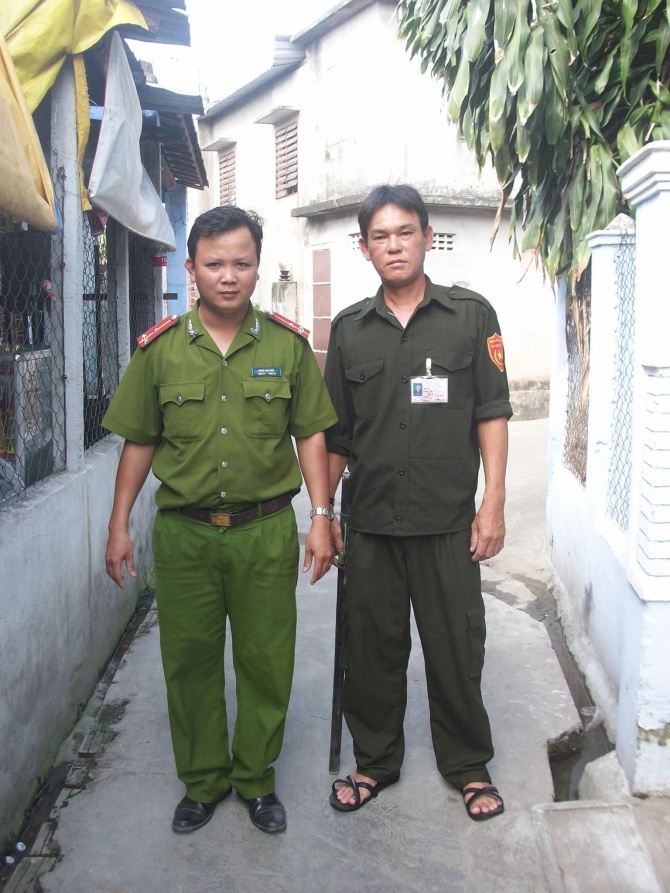 | Anh Hiệp trong một lần đi tuần tra cùng với các đồng chí công an khu vực. Ảnh: Đời sống & Pháp luật. |