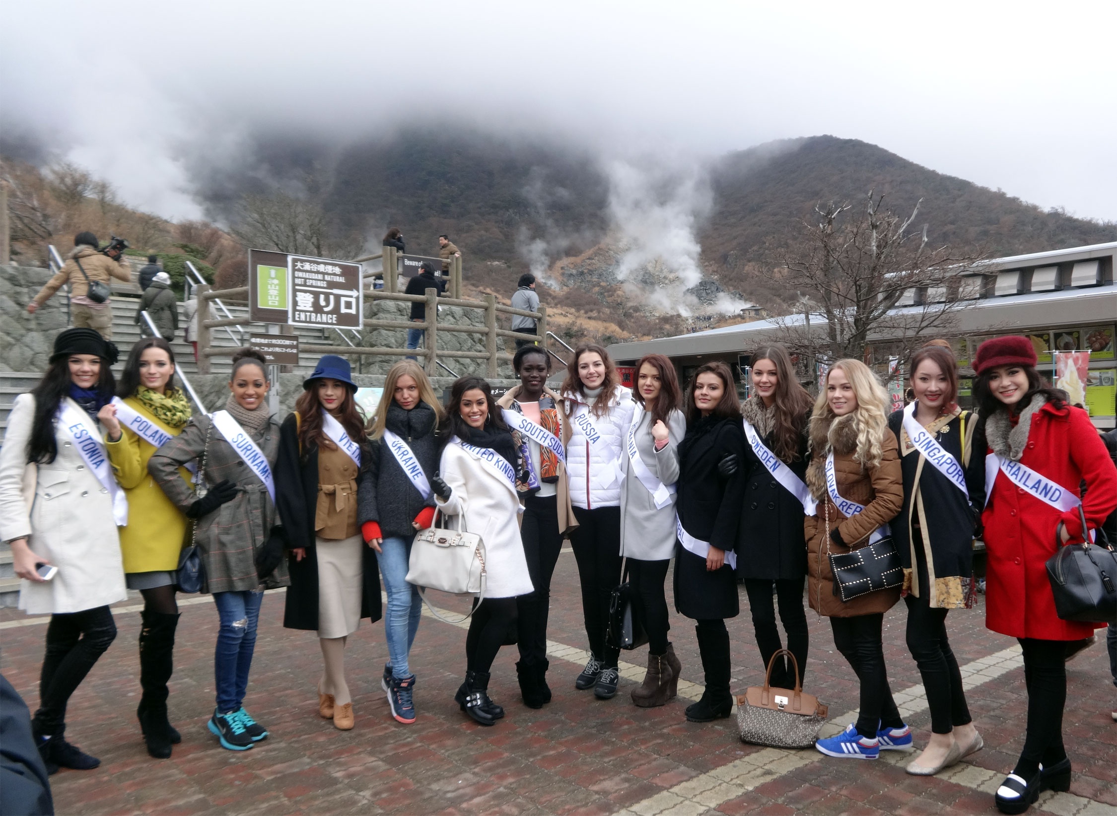 | Ngày 8/12, các thí sinh được tham quan các danh lam thắng cảnh nổi tiếng ở vùng Hakone, thung lũng Owakudani, ngọn núi lửa Hakone phun trào lần cuối cùng vào khoảng 400.000 năm trước, hồ Ashi, núi Phú Sĩ nổi tiếng… Các người đẹp vô cùng thích thú khi được tận mắt chiêm ngưỡng những cảnh đẹp của Nhật. |
