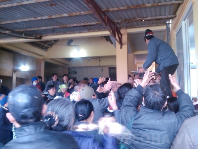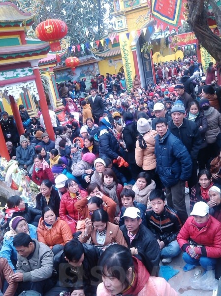 | Một đồng cô cho biết: Để giải hạn cho gia đình thì nên làm sớ và đặt lễ ít nhất là 100.000 đồng. Khi trời đã về trưa, chúng tôi được diện kiến “Mẫu” The (tên thật là Đoàn Thị The) khi dòng người vẫn đang xô đẩy để mong được nhìn tận mắt người mà xưa nay họ vẫn tôn là “Mẫu”. Trong ảnh: Hàng ngàn người về với “Mẫu” vào ngày Rằm tháng Giêng, để có mặt trong đền “Mẫu”, nhiều người phải đi từ ngày hôm trước |