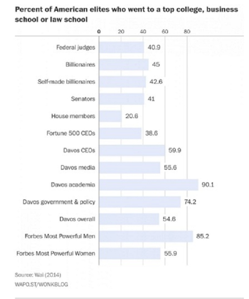 Những người tốt nghiệp trường danh tiếng thường thành công. 40% trong số các tỷ phú, CEO và thẩm phán tốt nghiệp cử nhân, thạc sĩ hoặc có bằng luật từ đại học nổi tiếng. Tuy nhiên, những bộ hồ sơ đẹp này không phân bổ đồng đều ở các lĩnh vực. Chỉ 20% thành viên Nghị viện theo học trường danh tiếng.