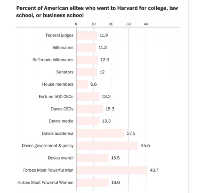 Khoảng 12% thẩm phán liên bang, thượng nghị sĩ và tỷ phú tốt nghiệp từ Harvard. Phải chăng sinh viên Harvard đang chiếm ưu thế trong giới thượng lưu? Nó cũng dẫn đến một câu hỏi khác: Liệu 12% người thông minh nhất, giỏi nhất đều từng học Harvard?