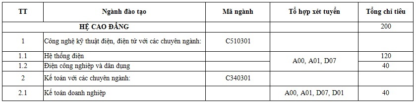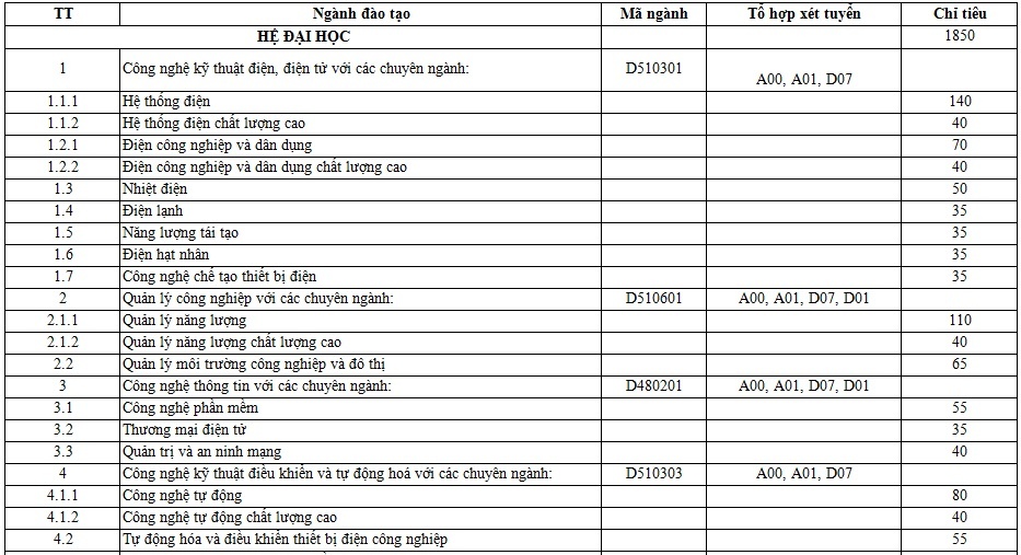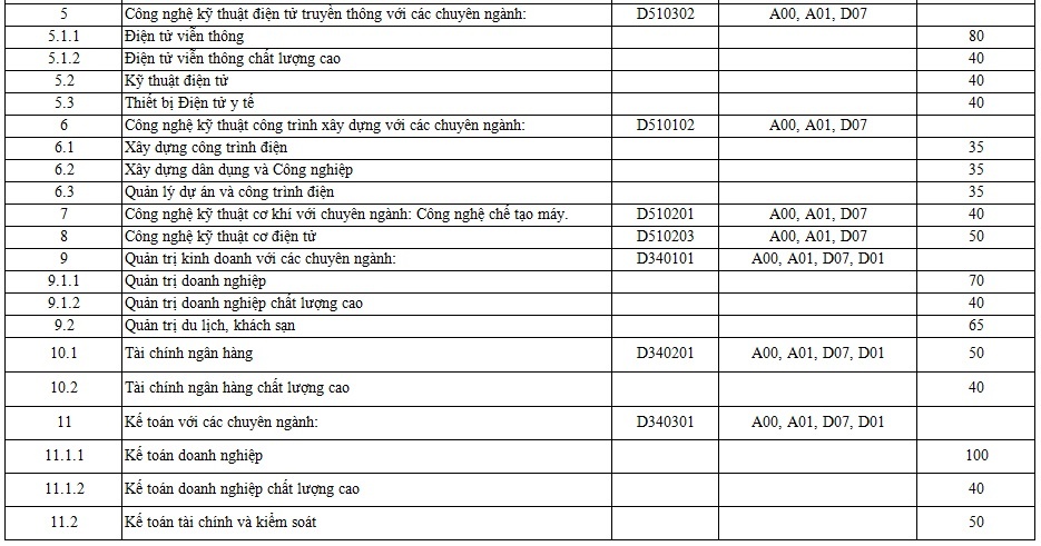 Danh sách ngành đào tạo và chỉ tiêu xét tuyển: