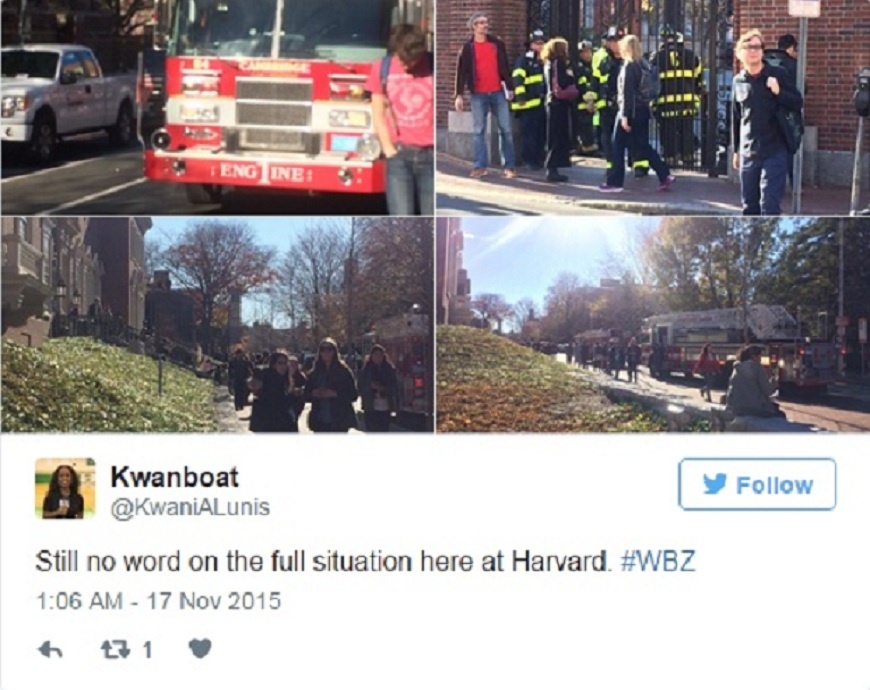 "Sự an toàn của các thành viên trong cộng đồng Harvard luôn là mối quan tâm hàng đầu của chúng tôi. Những vụ khủng bố gần đây, từ Paris đến Beirut và các vụ khác, khiến chúng tôi hiểu rằng, việc đe dọa này gây ra nỗi lo lớn đối với nhiều người đang học tập, công tác tại trường. Harvard sẽ tiếp tục thận trọng hơn...", Phó hiệu trưởng Katie Lapp cho biết.