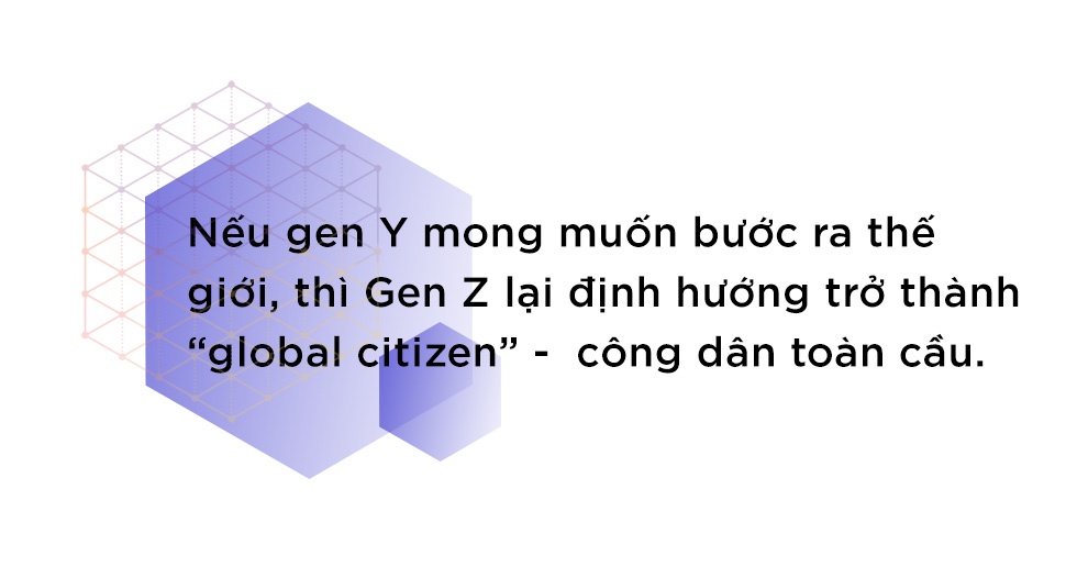 Lớn lên trong thời đại bùng nổ Internet, khi con người dễ dàng “rút ngắn” khoảng cách giữa các quốc gia bằng smartphone và mạng xã hội, gen Z sở hữu nhiều đặc điểm khác biệt thế hệ trước. Người trẻ sinh sau năm 1996 cởi mở, có xu hướng rời bỏ khuôn mẫu, thích khám phá bản sắc của các nền văn hóa. Trong khi gen Y mong muốn bước ra thế giới, thì gen Z lại định hướng trở thành “global citizen” - công dân toàn cầu.