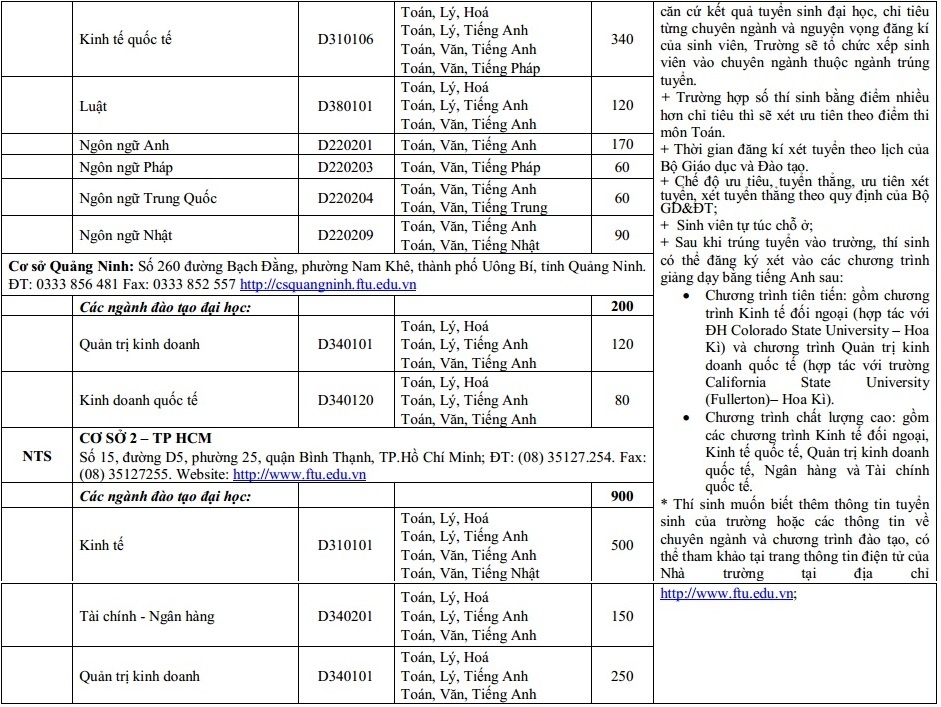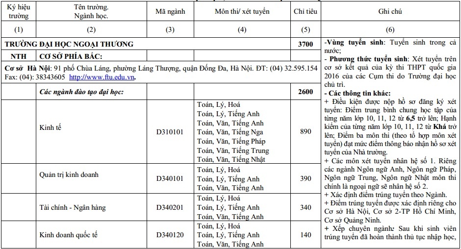 Năm 2016, Đại học Ngoại Thương xét tuyển 3.700 chỉ tiêu, tăng 500 chỉ tiêu so với năm ngoái. Trong đó, cơ sở Hà Nội tuyển 2.600 chỉ tiêu, 200 chỉ tiêu ở Quảng Ninh và 900 chỉ tiêu ở cơ sở TP HCM.