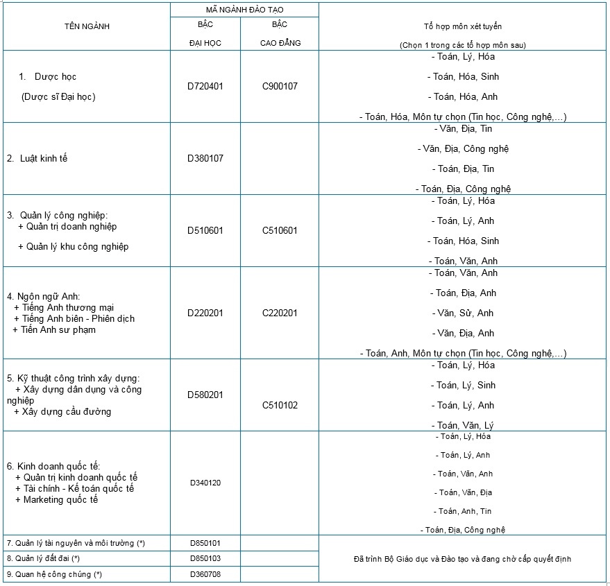 Các ngành và tổ hợp xét tuyển đợt 1 năm 2016:
