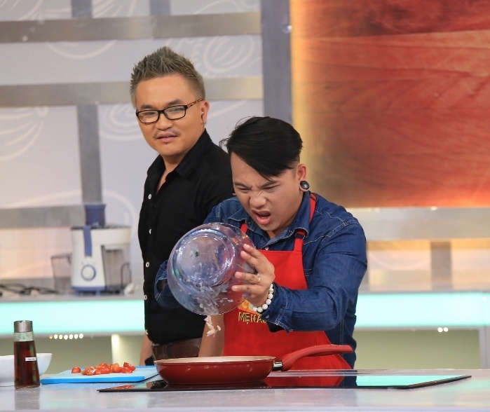 | Trong những phút đầu, Gia Tuấn vừa chạy vừa thở để gom tất cả nguyên liệu vào trong tầm tay mình. Quá tham nguyên liệu nên chàng đạo diễn phải dùng cả chân để đá thúng rau về gian bếp. Không những thế, anh còn nhầm lẫn giữa dầu mè và nước mắm, nước mía lộn với dầu ăn. |