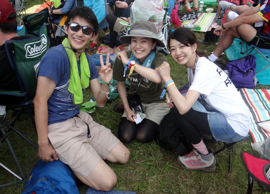 Đối tượng khán giả chính của Fuji Rock Festival là các thanh niên. Anh Hayato (bìa trái), 29 tuổi, có năm thứ chín liên tiếp tham dự sự kiện. Năm nay, anh đi cùng Yumiko và Yuko, hai người chưa từng có cơ hội trải nghiệm lễ hội âm nhạc trong quá khứ. Cả ba rất mong chờ được xem ban nhạc rock Ride của nước Anh. |