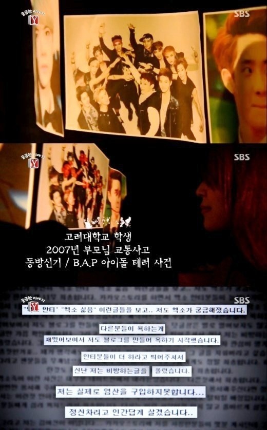 Ngày 28/2, đài truyền hình SBS của Hàn phát sóng chương trình Curious Story Y, trong đó tiến hành điều tra phân tích trường hợp một anti-fan, dưới bí danh là Kim Yeo Shin, gần đây đã dọa khủng bố nhóm nhạc đang lên EXO.