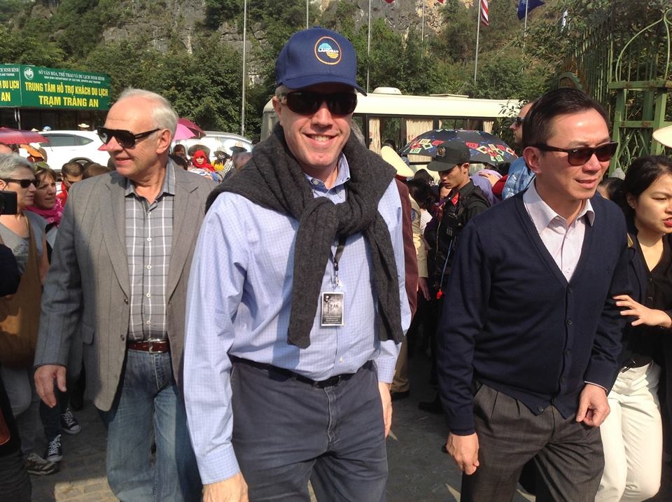 | Ông Ted Osius ăn vận lịch sự với áo sơ-mi, quần âu, tươi cười dẫn đầu đoàn tiến đến khu vực bến thuyền Tràng An, cách phim trường khoảng 700 m. |