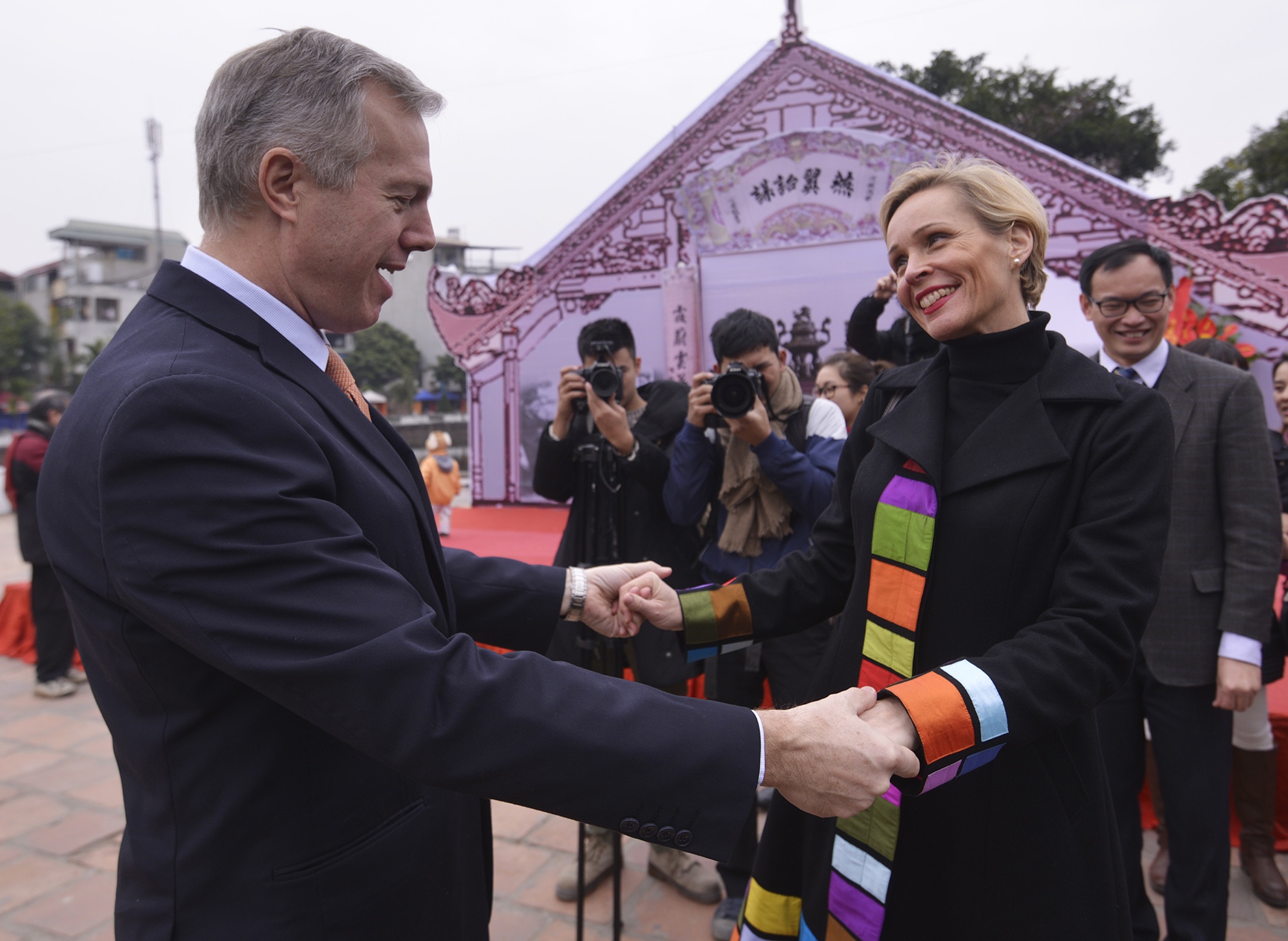 Sáng 3/2, Đại sứ Ted Osius tới Hồ Văn, phía trước Văn miếu Quốc Tử Giám, và để viết chữ thư pháp, đón Tết cổ truyền của Việt Nam. Ông tình cờ gặp Đại sứ Thụy Điển Camilla Mellander cũng tới đây. Ông Ted cho biết lựa chọn viết thư pháp chào đón năm Bính Thân vì nó rất có ý nghĩa trong văn hóa của người Việt trong mỗi dịp năm mới. Đại sứ Mỹ tới Văn Miếu thư pháp ngay sau khi trở về Hà Nội sau hành trình đạp xe tới Huế để kết thúc năm kỷ niệm 20 năm bình thường hóa quan hệ Việt - Mỹ. |
