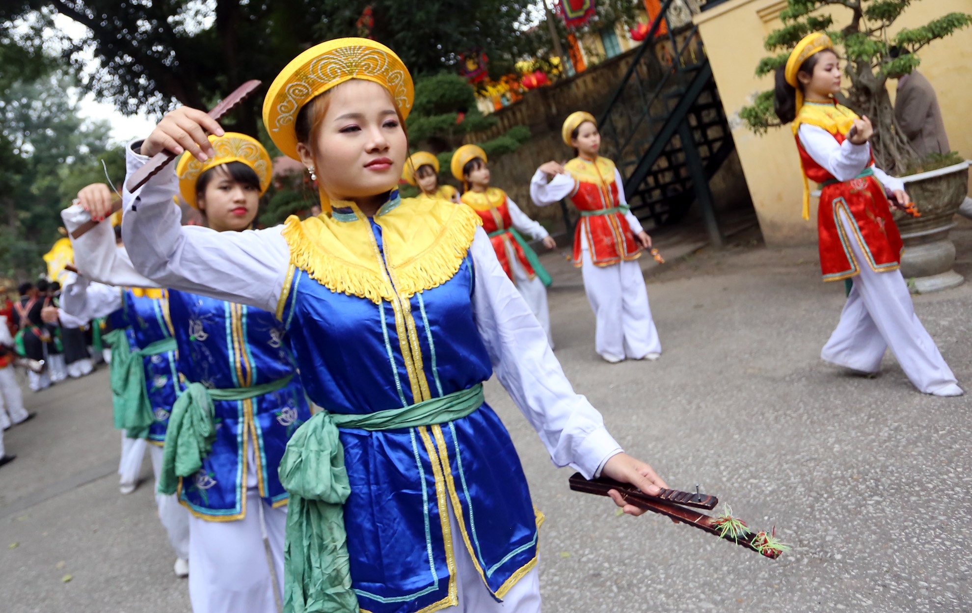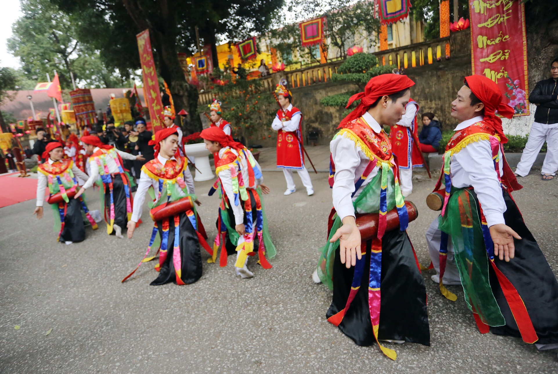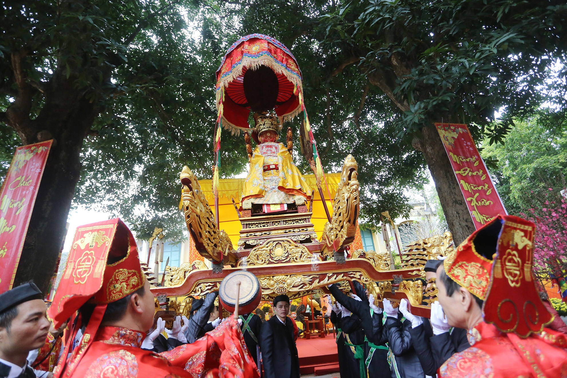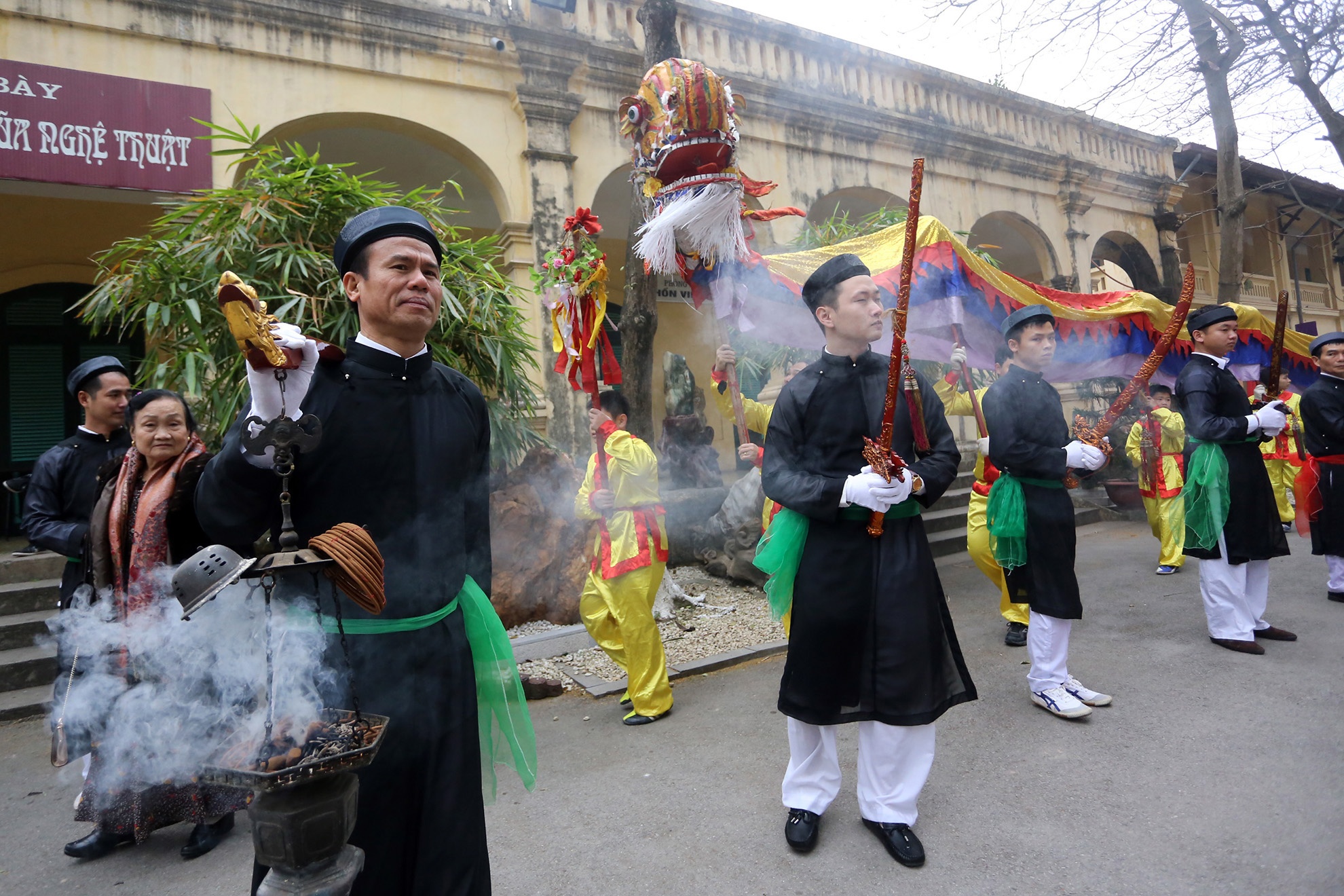 Các tiết mục đặc sắc như rước kiệu Sắc phong do các nghệ nhân làng Triều Khúc (Tân Triều, Hà Nội) tái hiện tại sân Đoan Môn. |