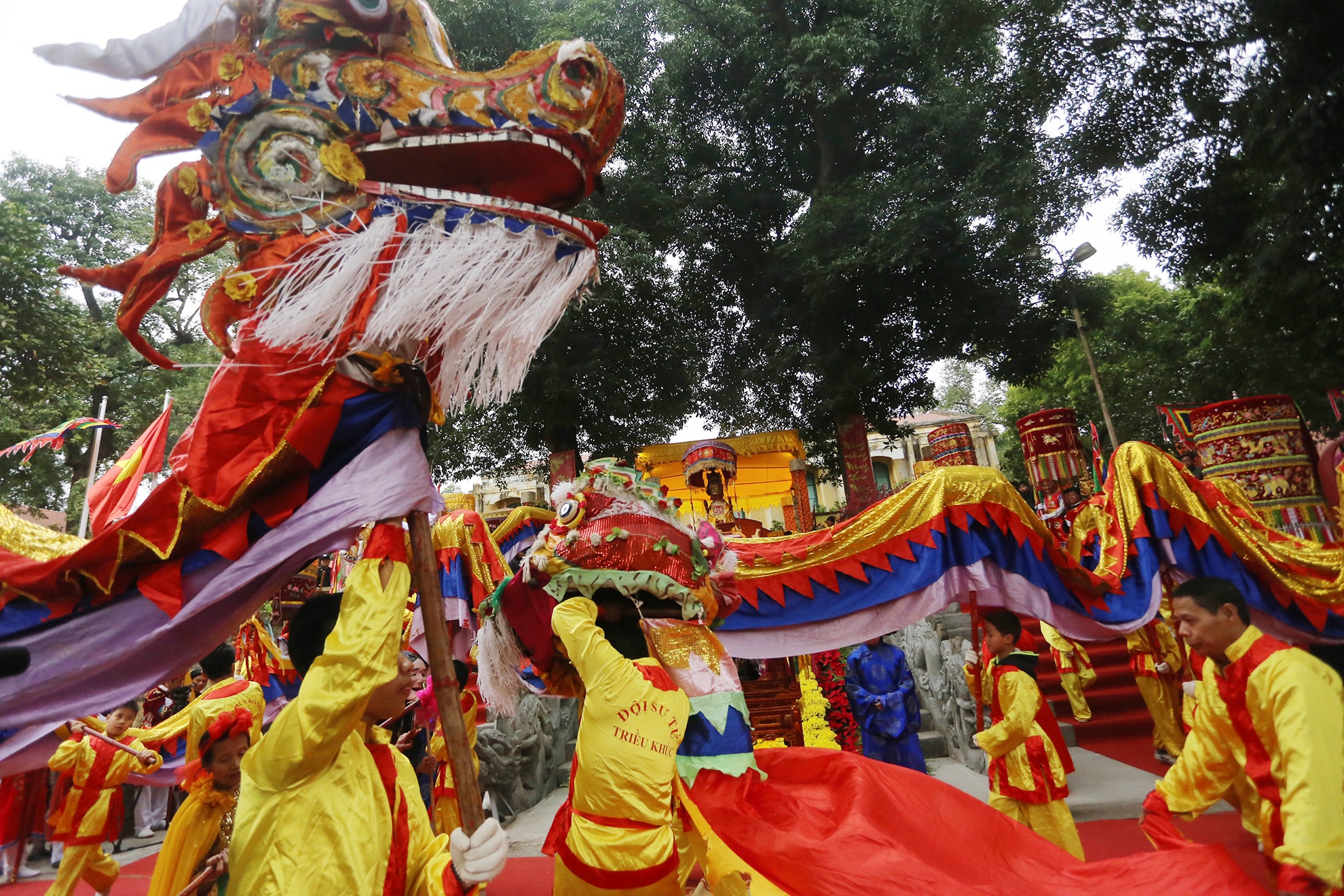 | Màn múa rồng của các nghệ nhân làng Triều Khúc. |